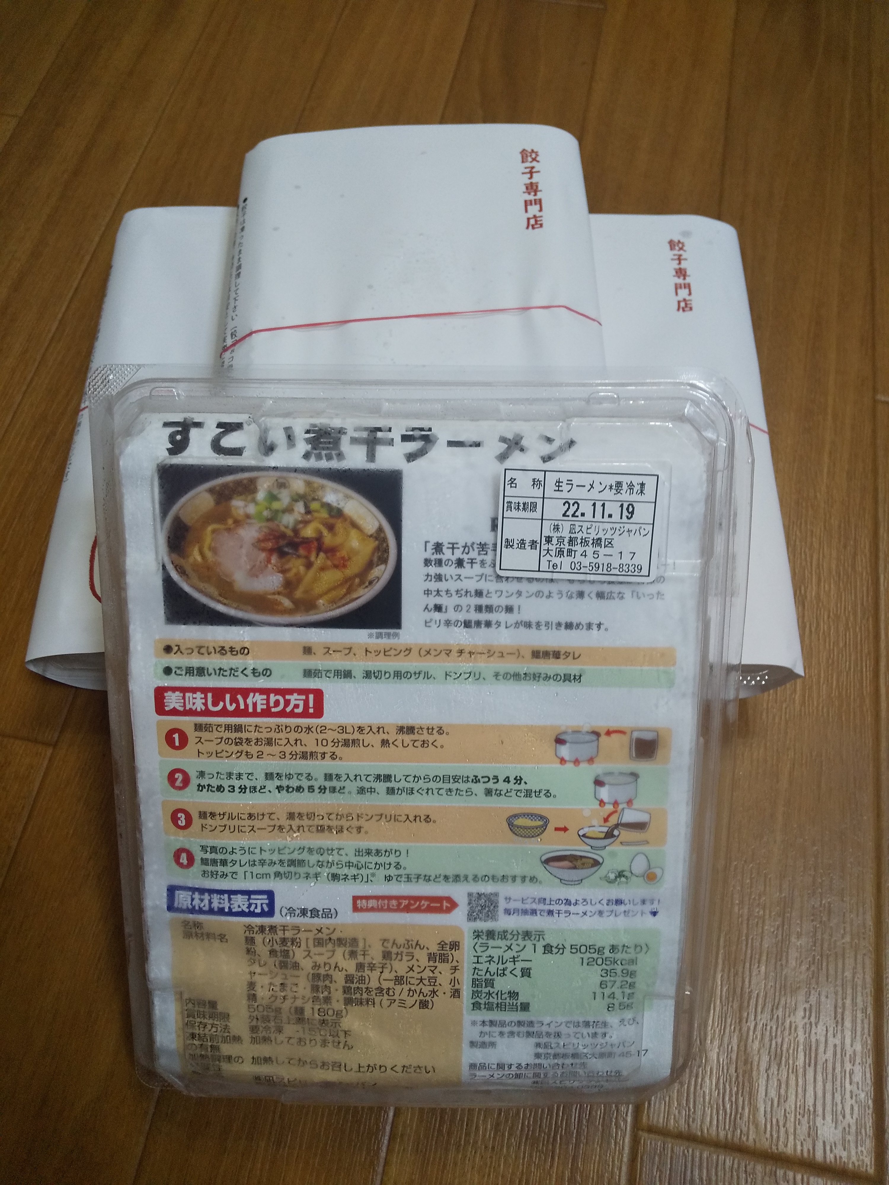 しっかりとした段ボール箱にラーメン一人前と8個入り餃子が3パック入っていました。