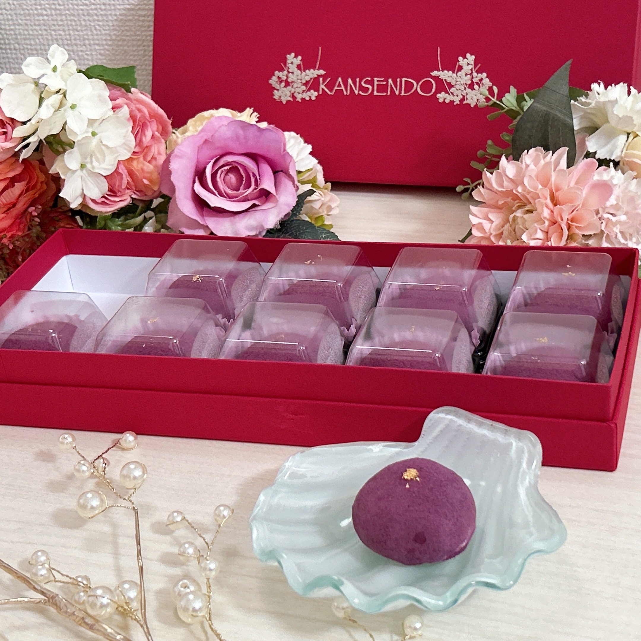 生スイートポテトを大福にアレンジした「洋風大福」です。南九州産サツマイモと国産生クリーム、バニラをあわせた餡は、ラム風味の大人味。100%国産もち粉を使用した、モチっとした食感の羽二重餅でくるんでいます。色鮮やかな紫芋パウダーでコーティングしているので、芋の香りがダイレクトに感じられます。金粉がトッピングされていて、高級感のある仕上がりになっています。オリジナルボックスに入って届くので、贈り物にもおすすめです。