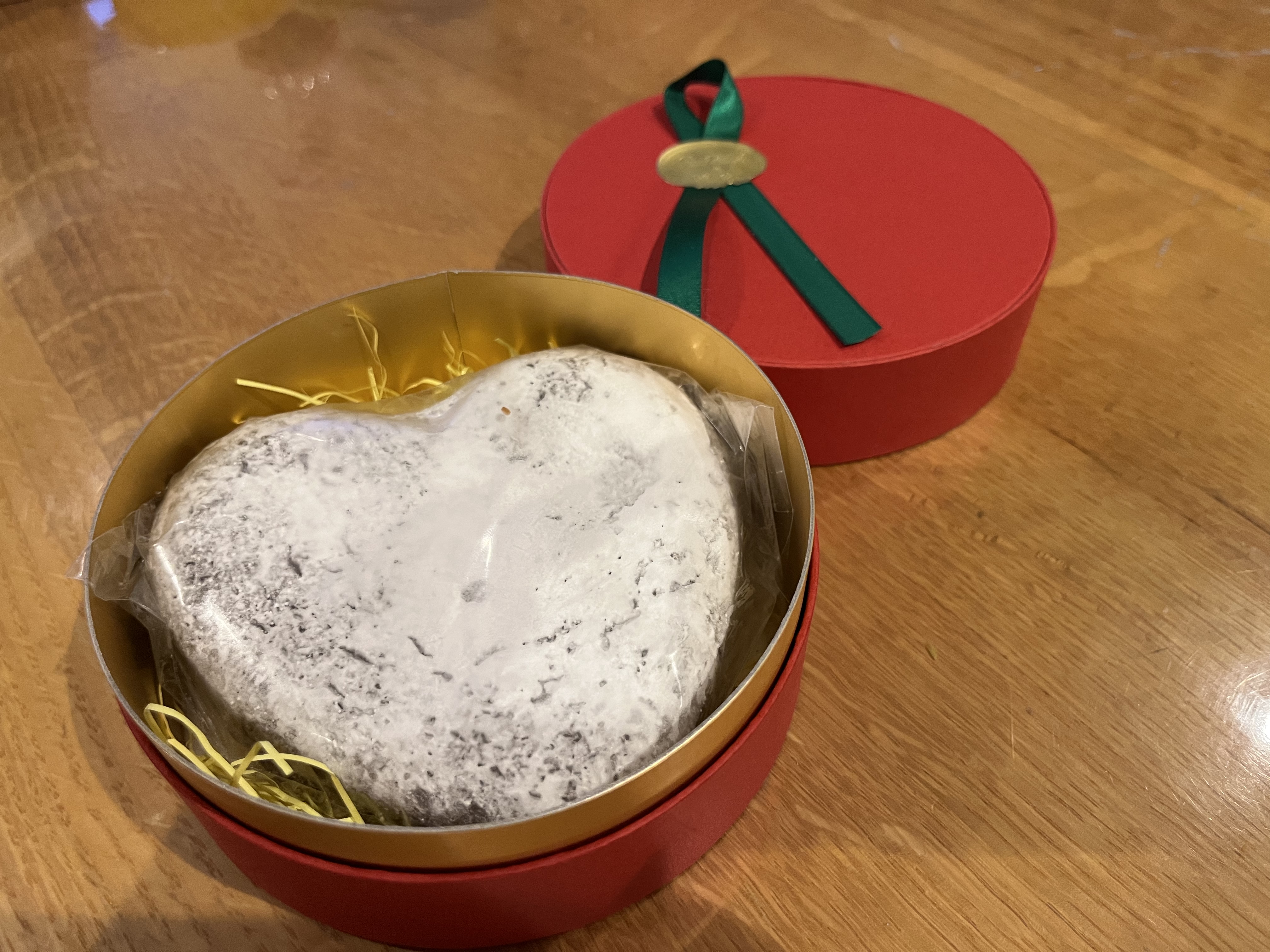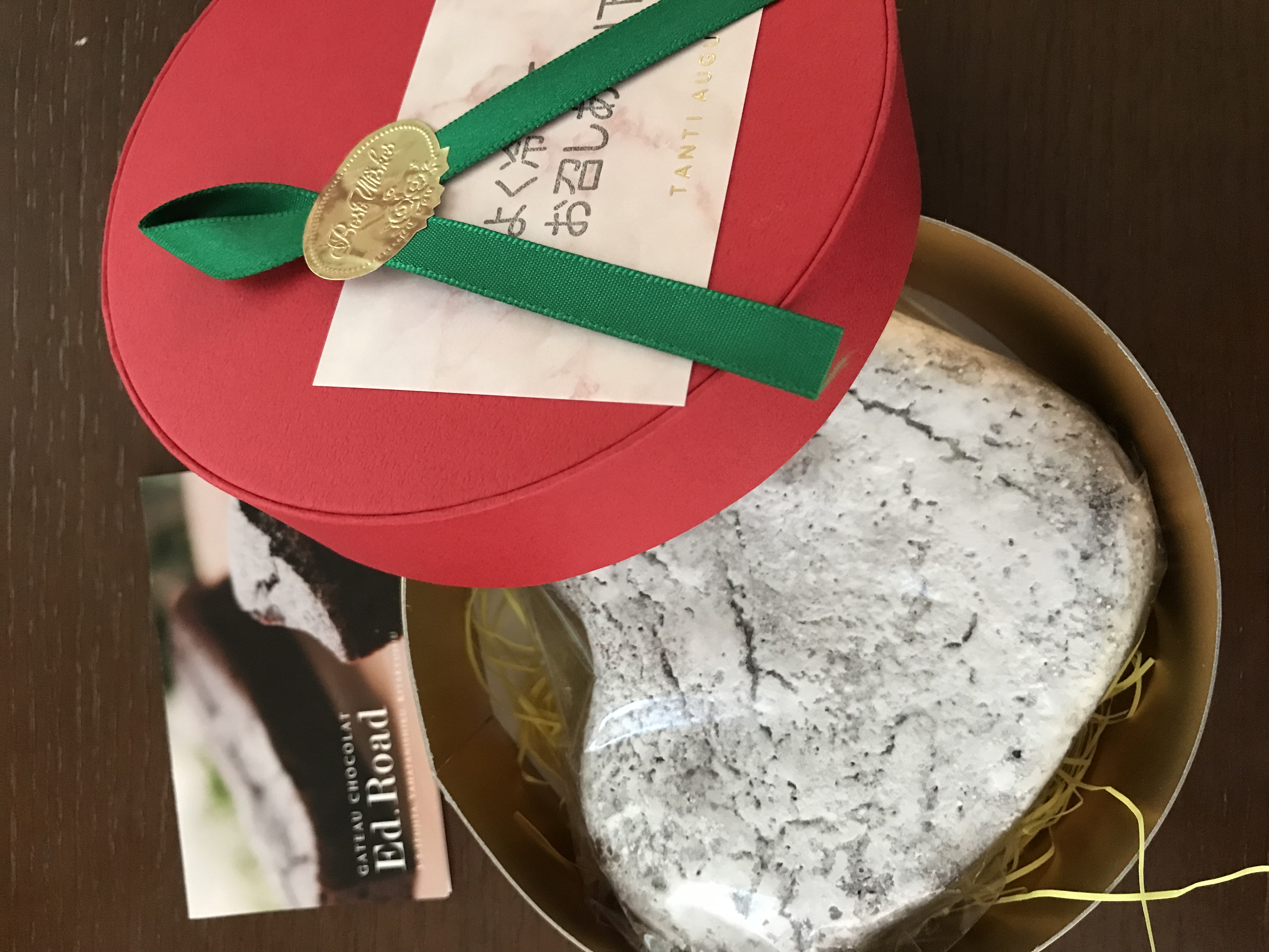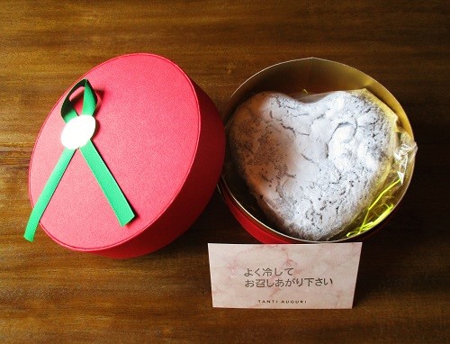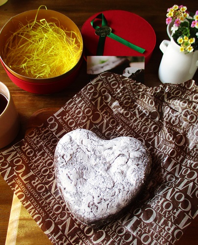 今回の商品「大きいハートガトーショコラ」。冷蔵庫で良く冷やしてお召し上がりください。冷蔵保存。