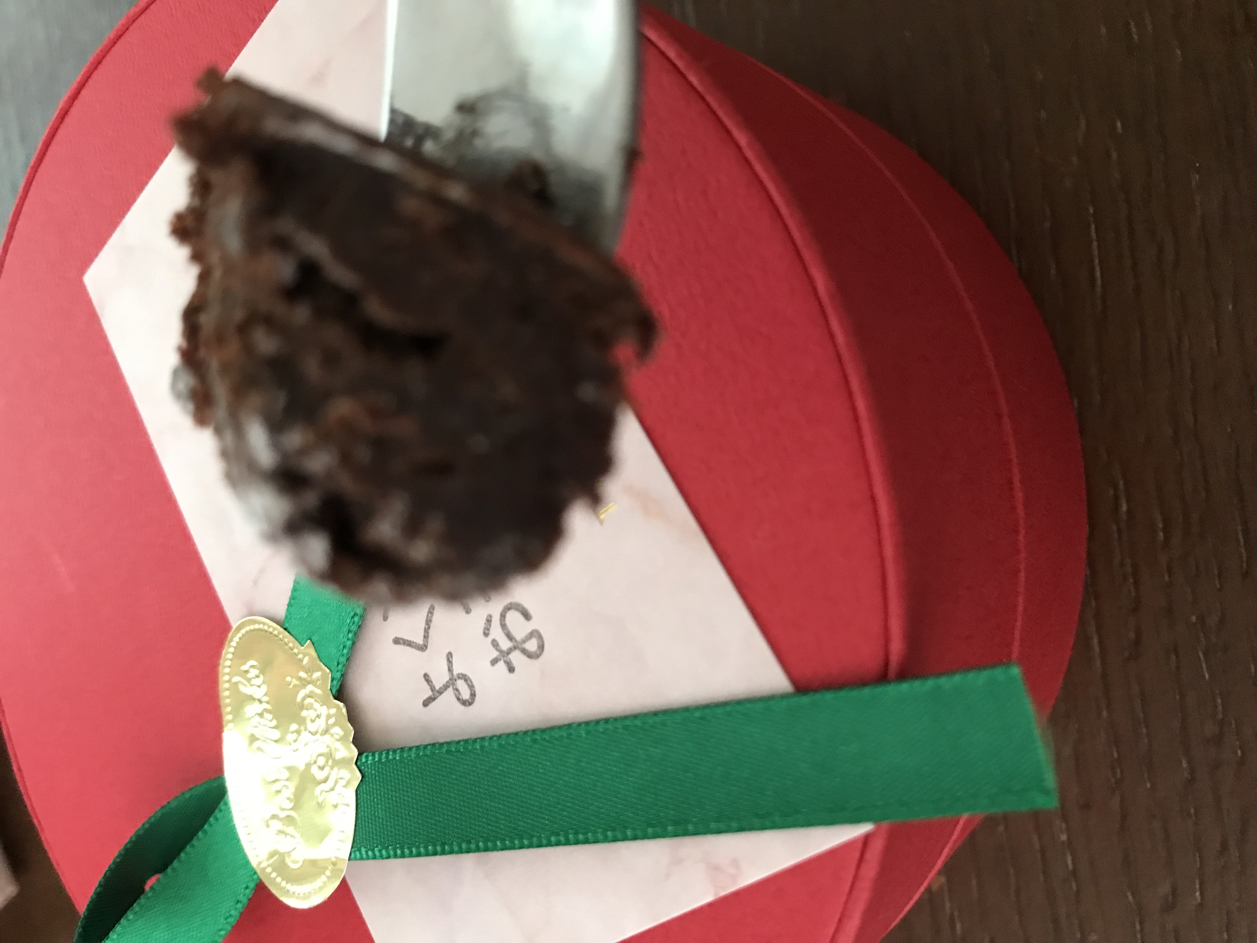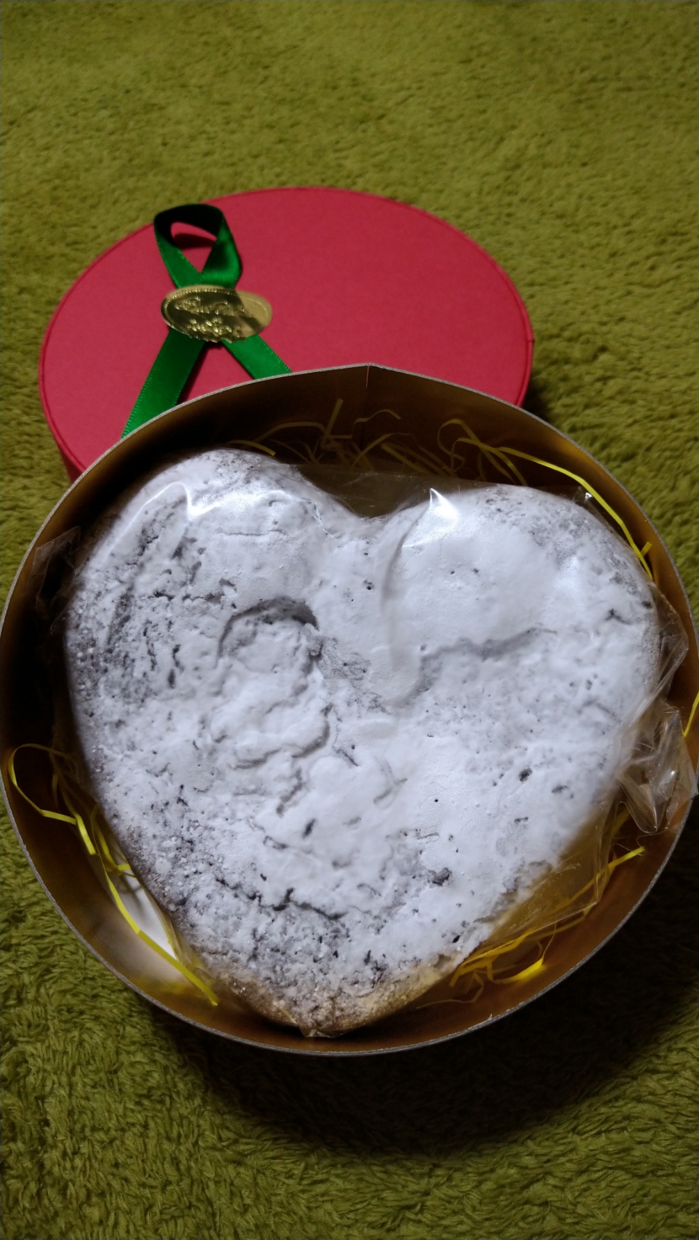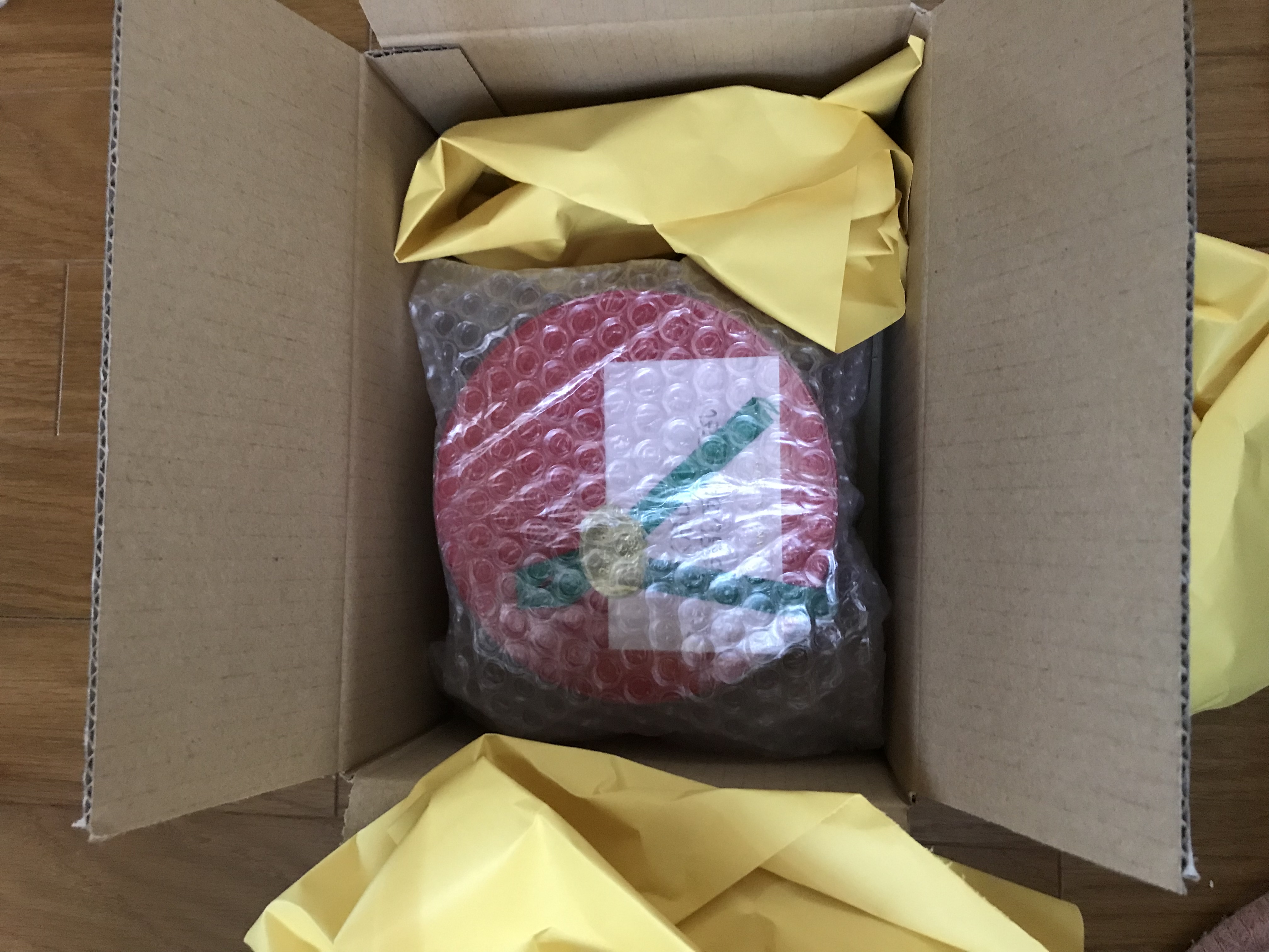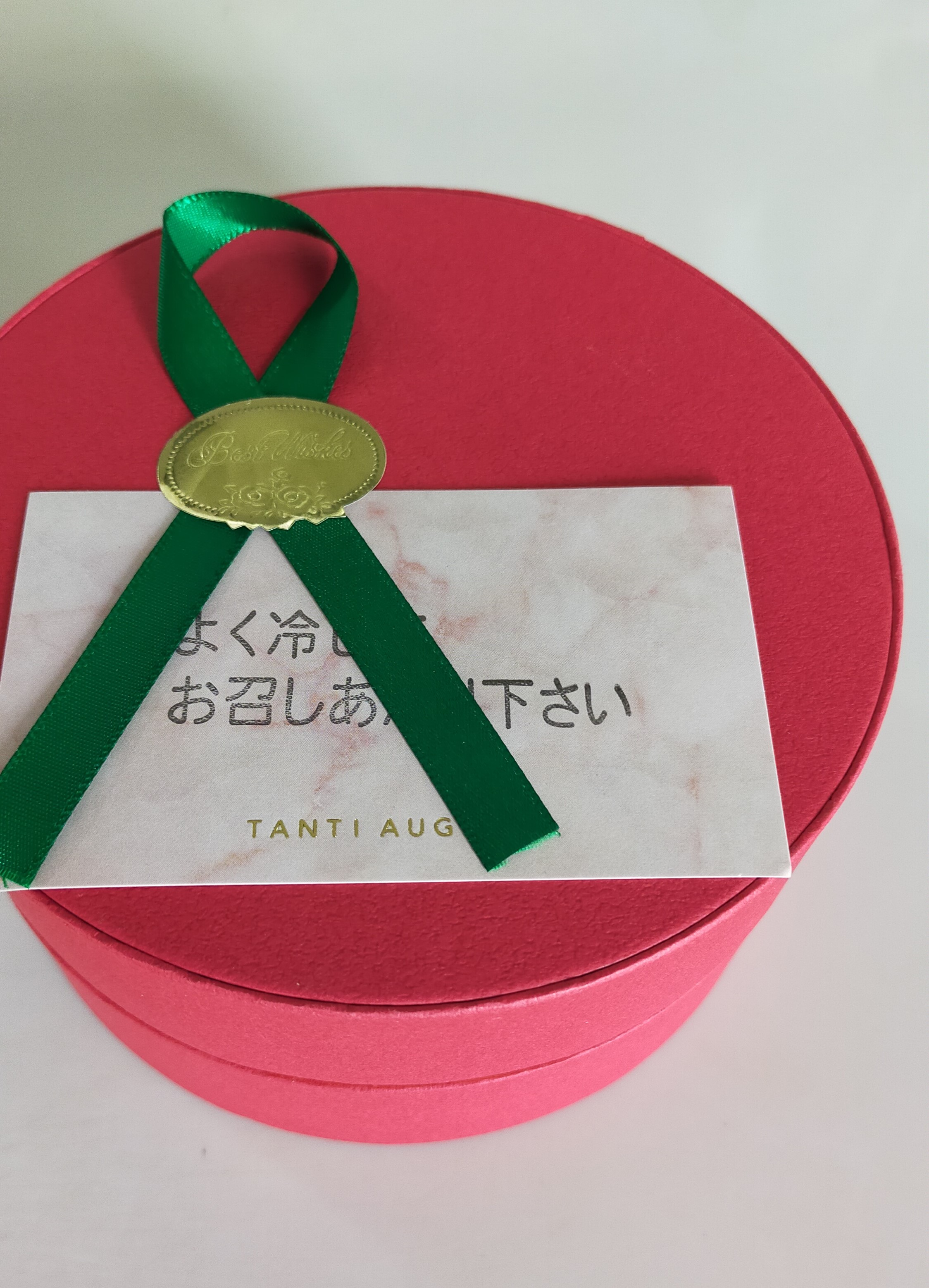 コンパクトな段ボールの中にはグリーンのリボンがアクセントになっている赤い丸い箱、。