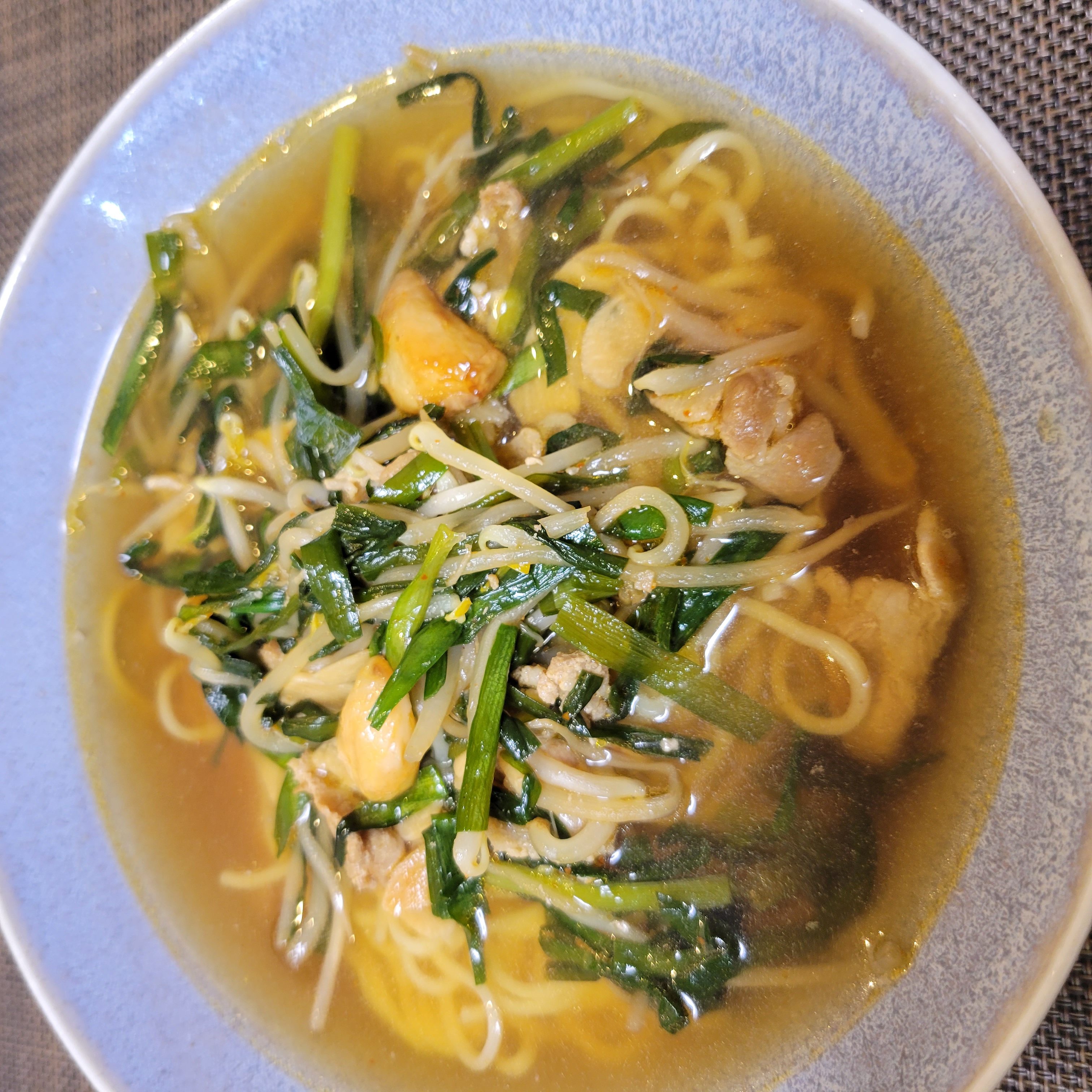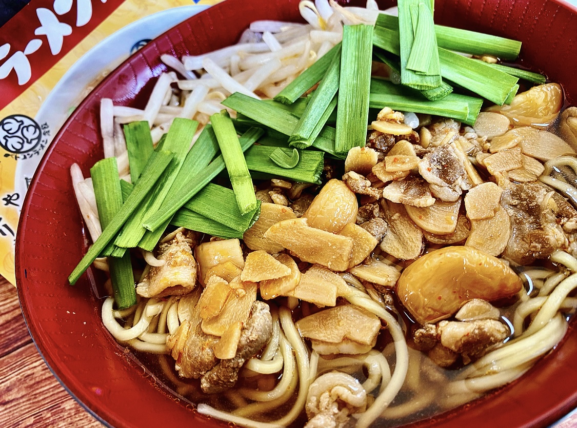 丸ごとまたは粗く砕いたニンニク数個・ニラ・長ねぎ・モヤシなど大量の野菜をトウガラシで辛く味付けして炒め、鶏ガラベースのスープを張った麺に載せる。しょうゆや味噌味や、鶏ガラと豚骨をベースにしたスープで提供する店もあります。