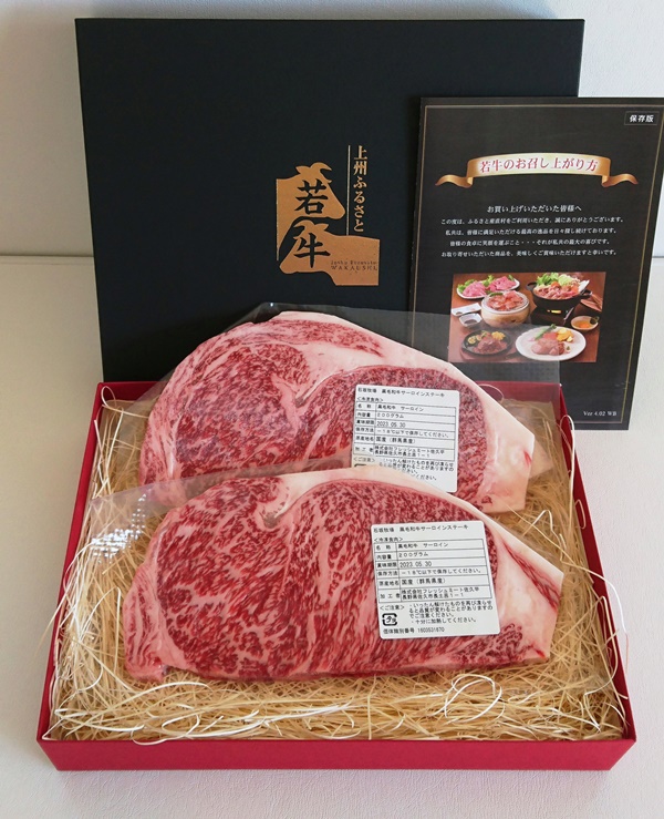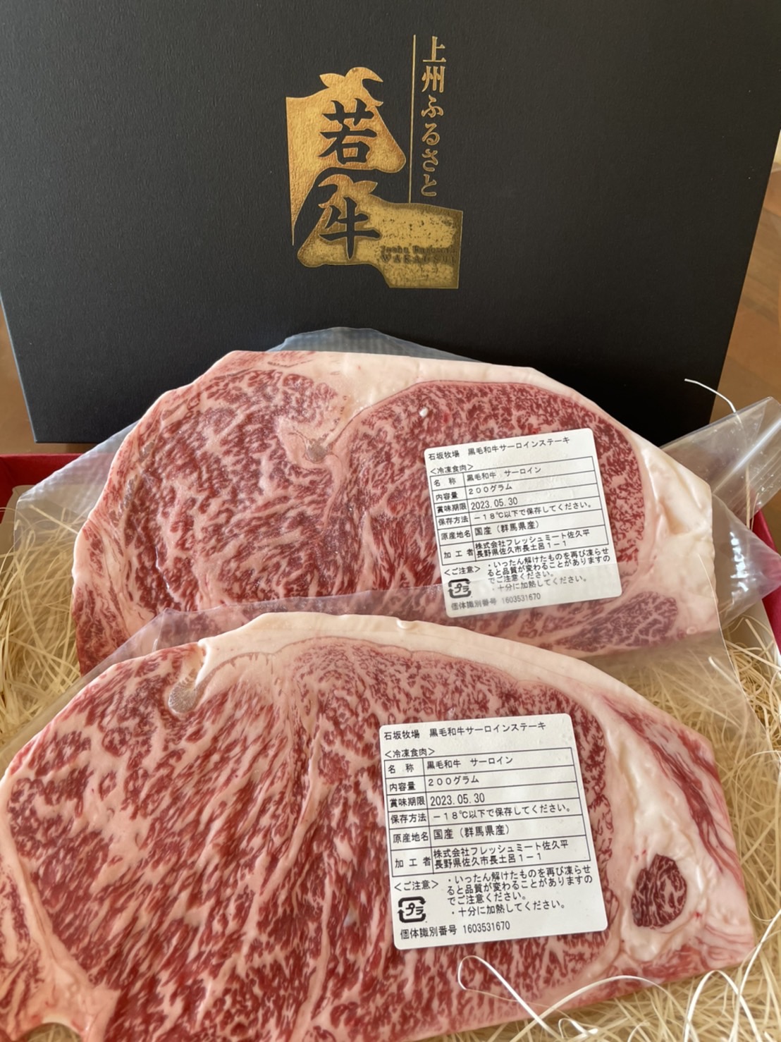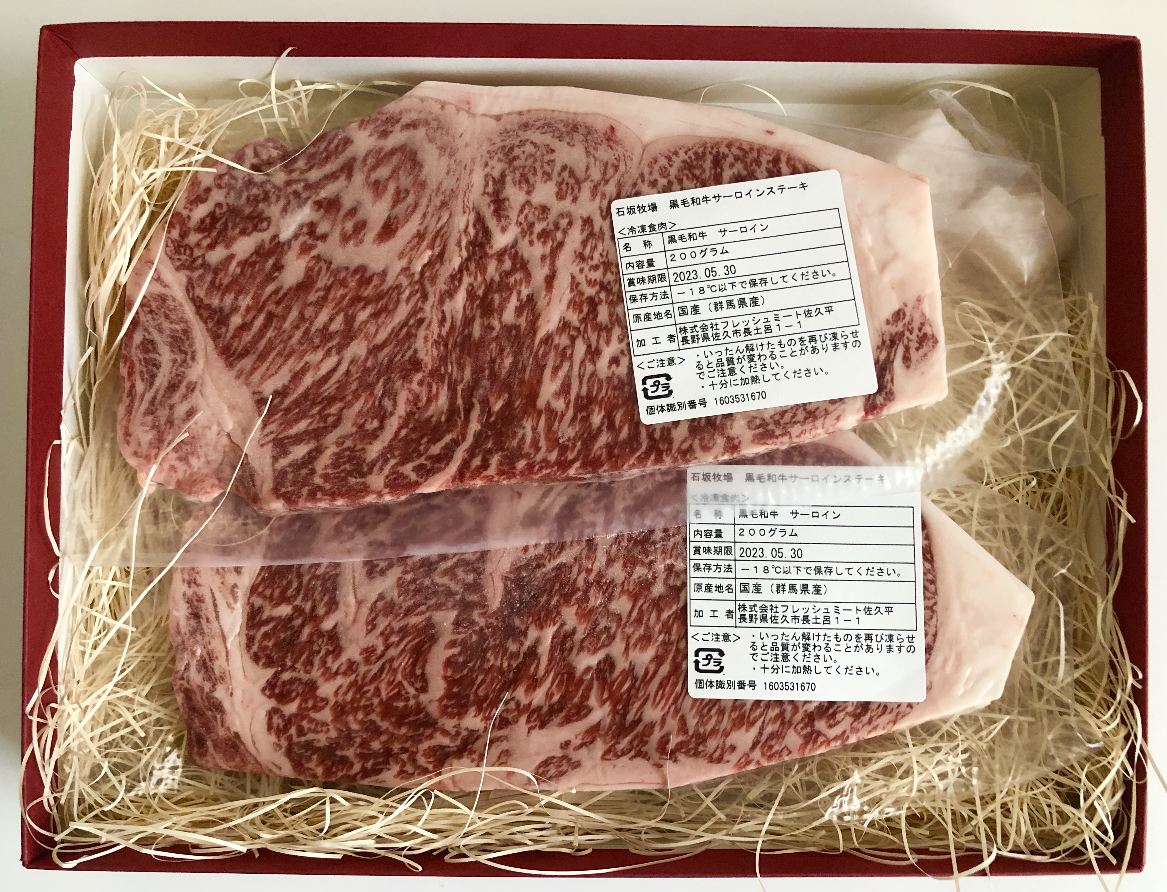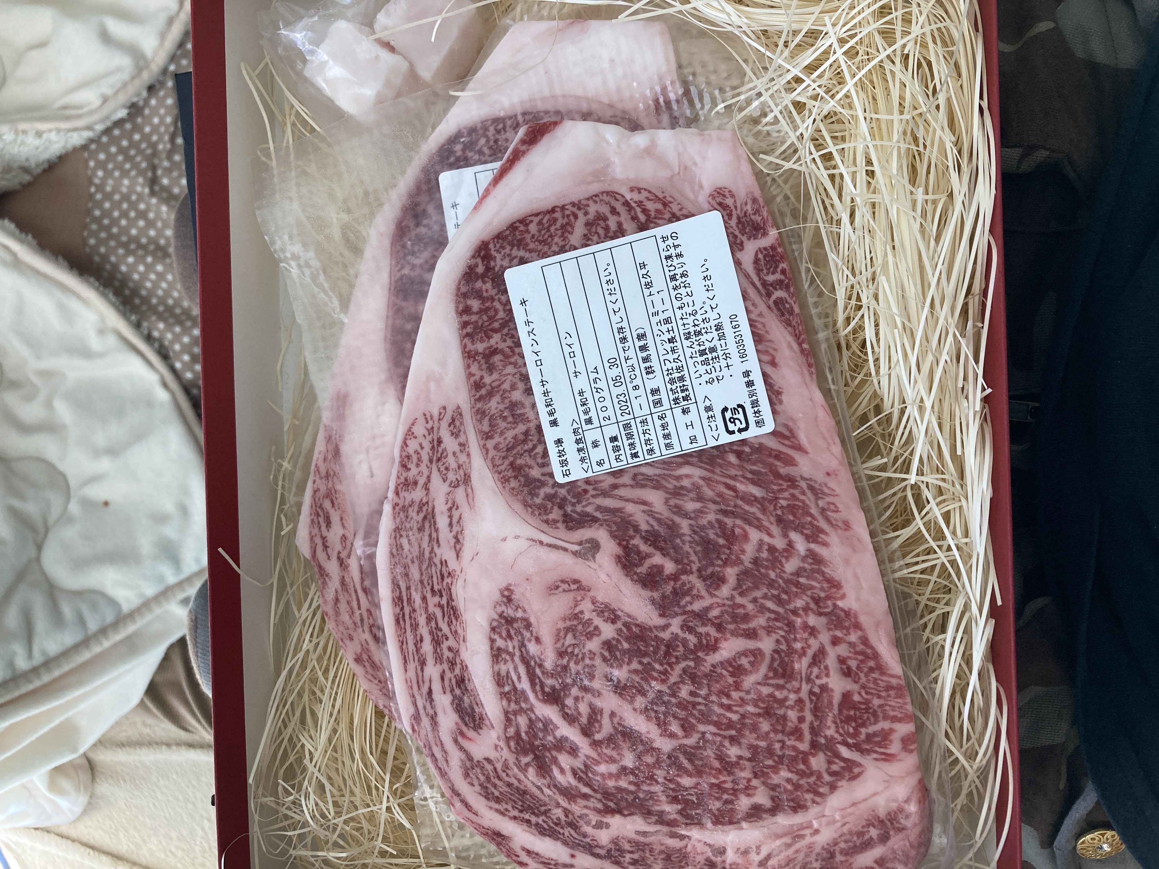 高級感のあるお箱を開けると、ドドーン!!と目に飛び込んできた若牛のサーロイン。こんなに大きいサーロインを今まで見たことがなかったので、家族みんなで「ウッキャー!」と大歓声でした。