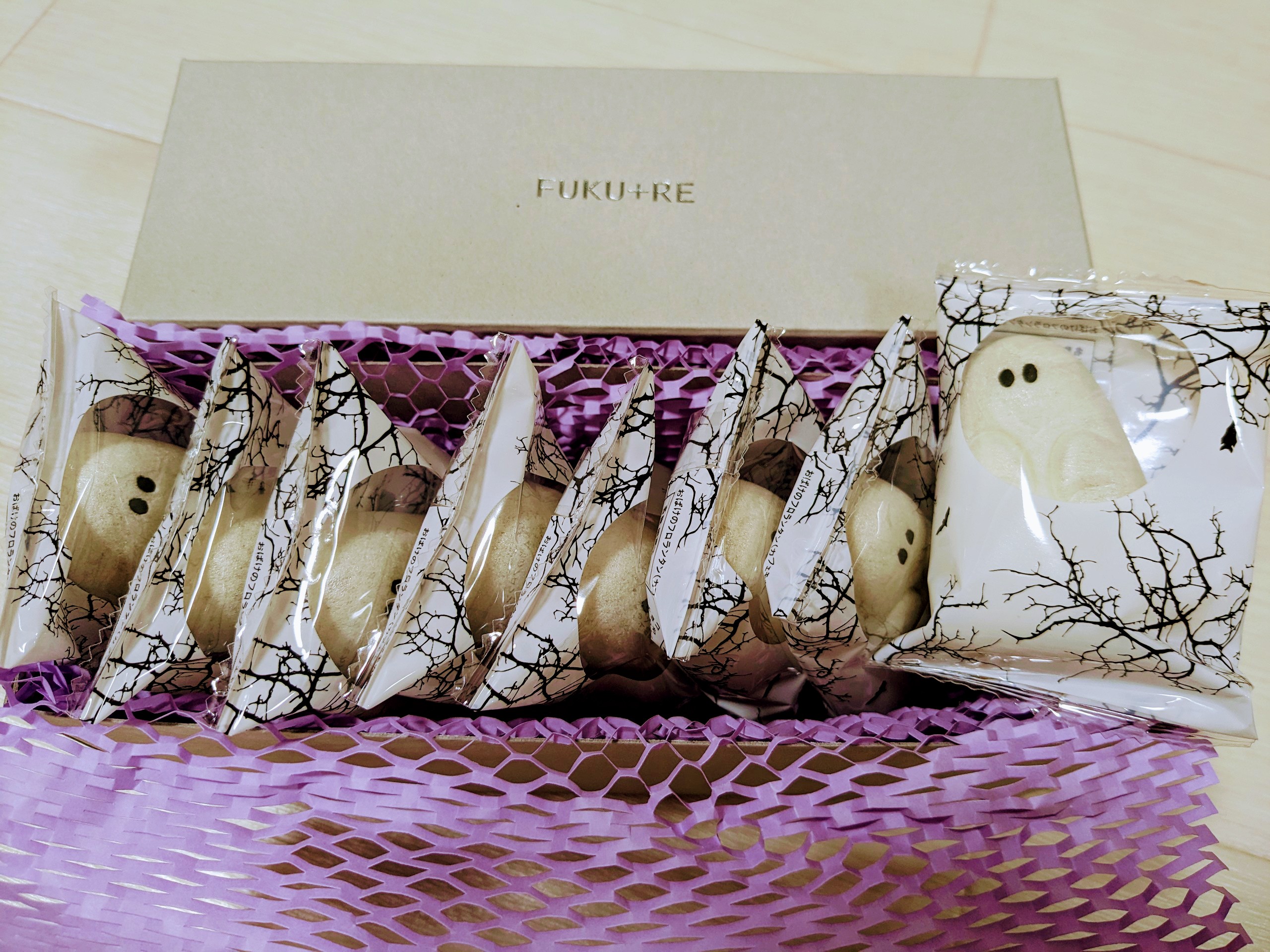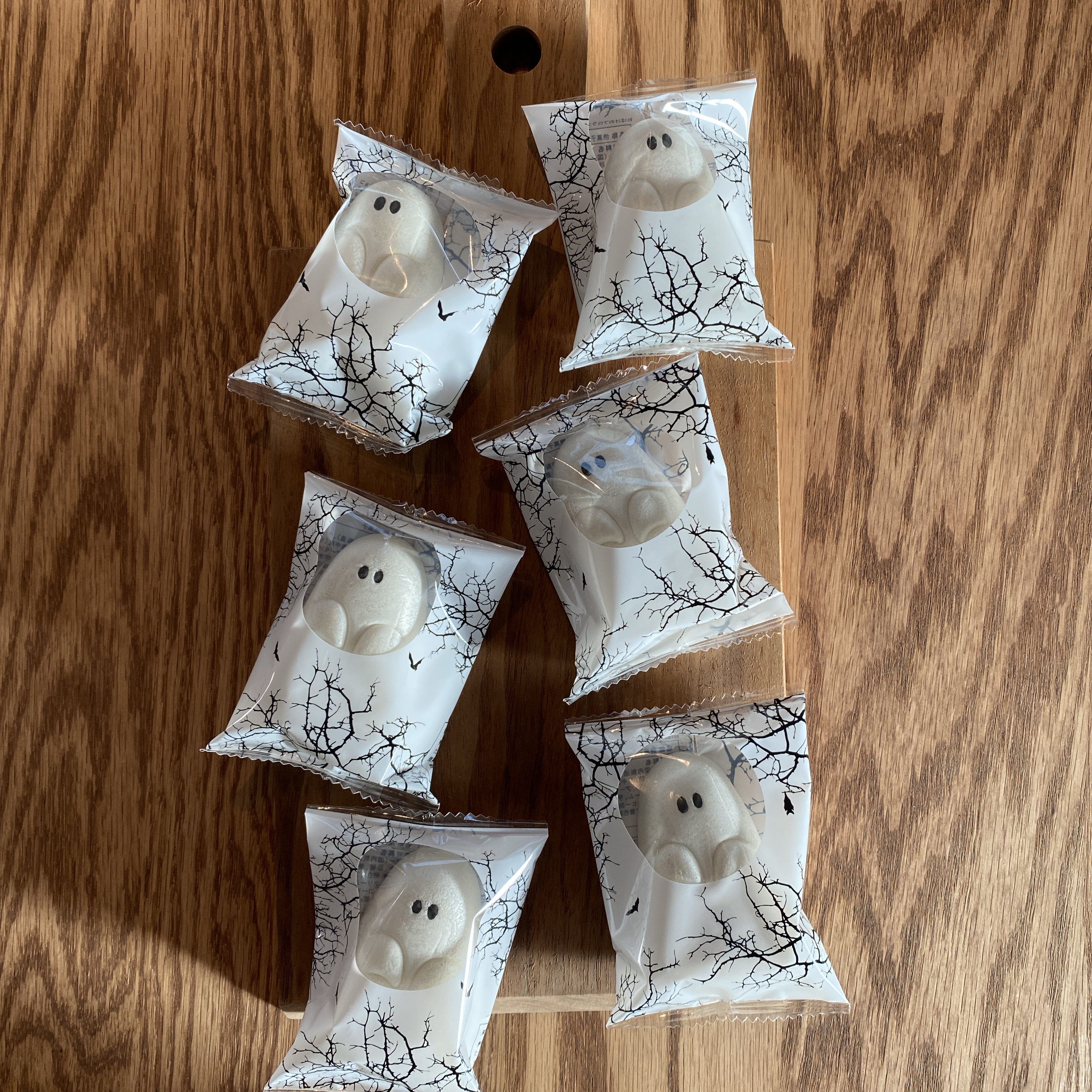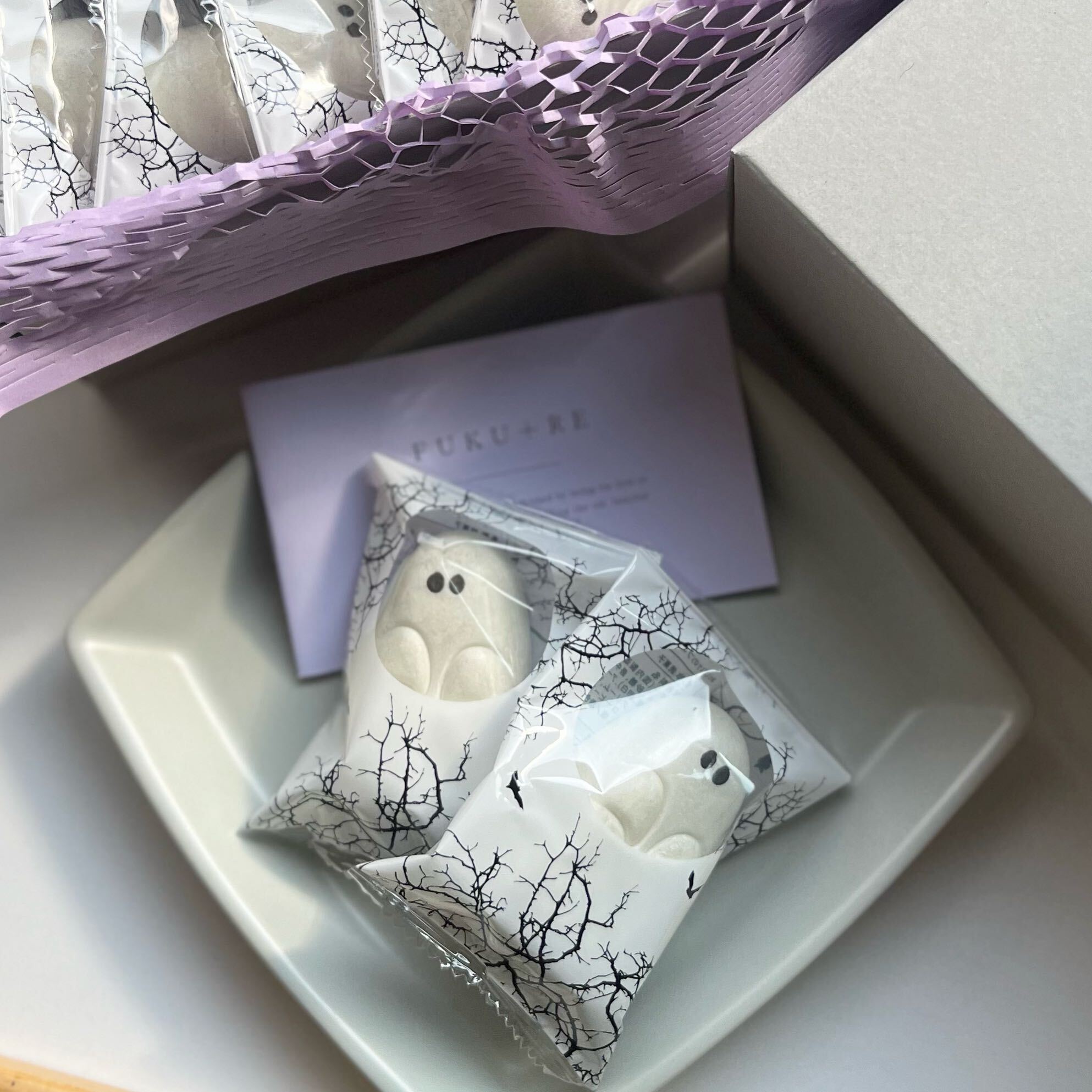 シンプルなグレーの箱に入っているのでオシャレな手土産にもいいんじゃないでしょうか。箱を開けたら1個づつ包装してある可愛いゴースト達!ハロウィンパーティーには盛り上がること間違いないと思います。見た目の可愛さとほろ苦の大人な味のフロランタンのギャップもすごくいいと思いました。