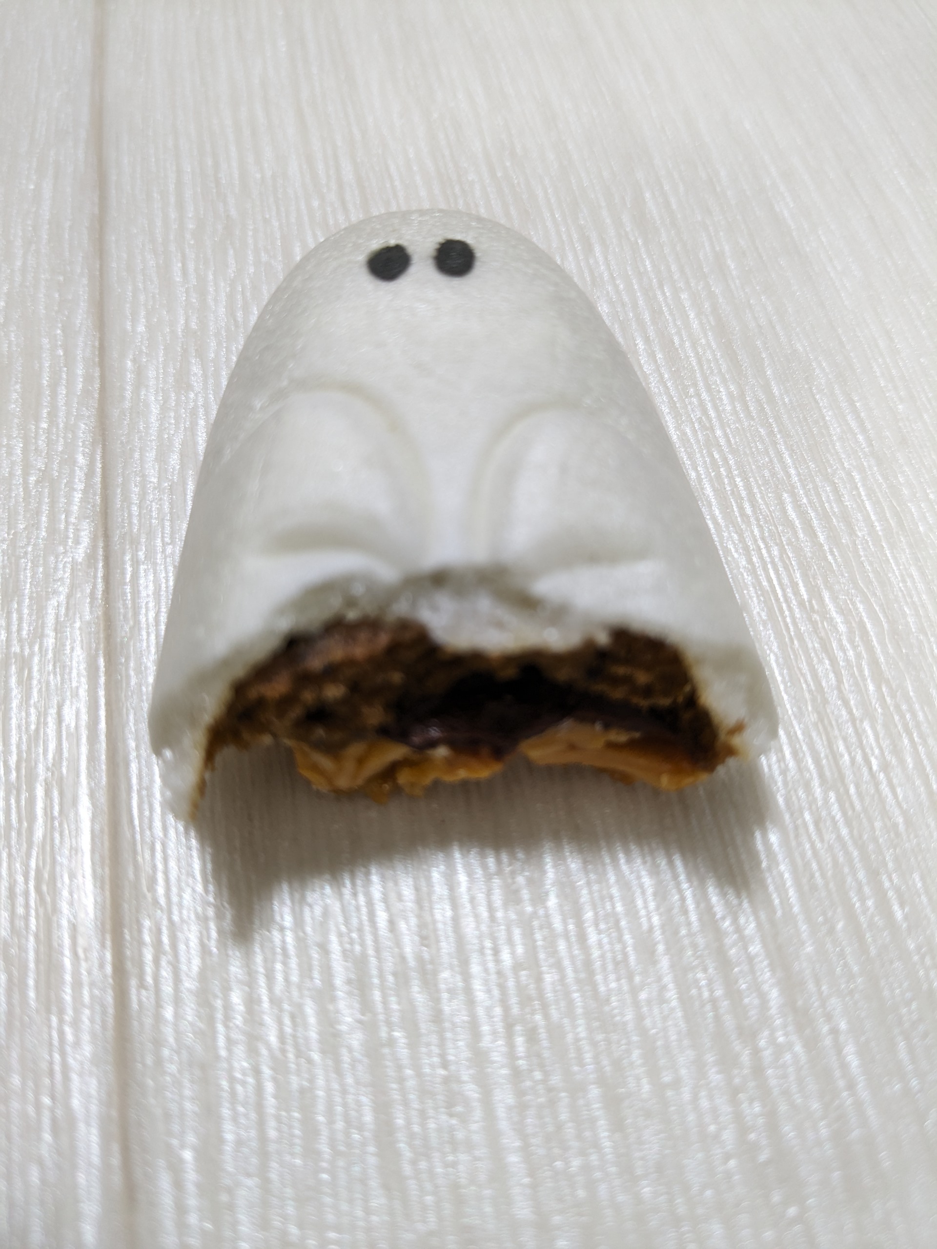 手のひらにすっぽり収まる可愛らしいゴースト型の「フロランタン」です。ゴースト型の最中皮にコーヒーサブレとチョコレート、フロランタンを詰めて焼き上げています。見た目はキュートですが、味は本格派。アーモンド・チョコレート・サブレ・最中の4層構造になっていて、サクッと口当たり軽く、さまざまな食感を楽しめます。個包装になっているので、ハロウィンパーティの手土産やお配りスイーツなどにおすすめです。