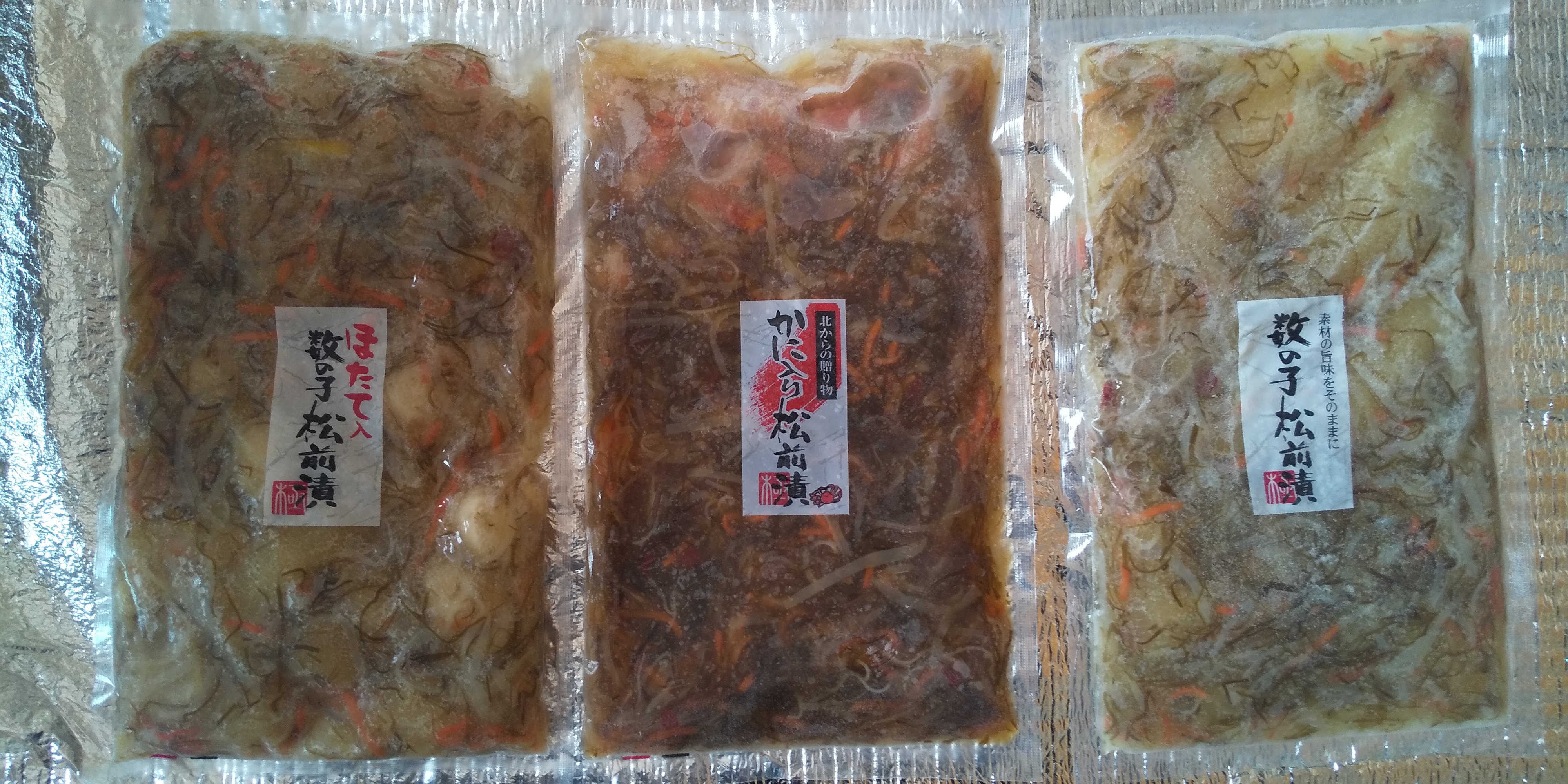 北海道にある「鮨かわむら」の川村料理長監修「松前漬」です。一本羽を使い、コリコリ・ポリポリとした歯ごたえを楽しめる「数の子松前漬」、身がギュッと締まったズワイガニが入った「ズワイガニ入松前漬」、弾けそうなほどプリプリのホタテが入った「ホタテ入松前漬」の3種セット。お酒のつまみとしてや、白いご飯と一緒にそのまま楽しむだけでなく、熱いお茶をかけてお茶漬けとして食べるのもおすすめ。豪華なセットなので、お中元などの贈り物にも最適です。