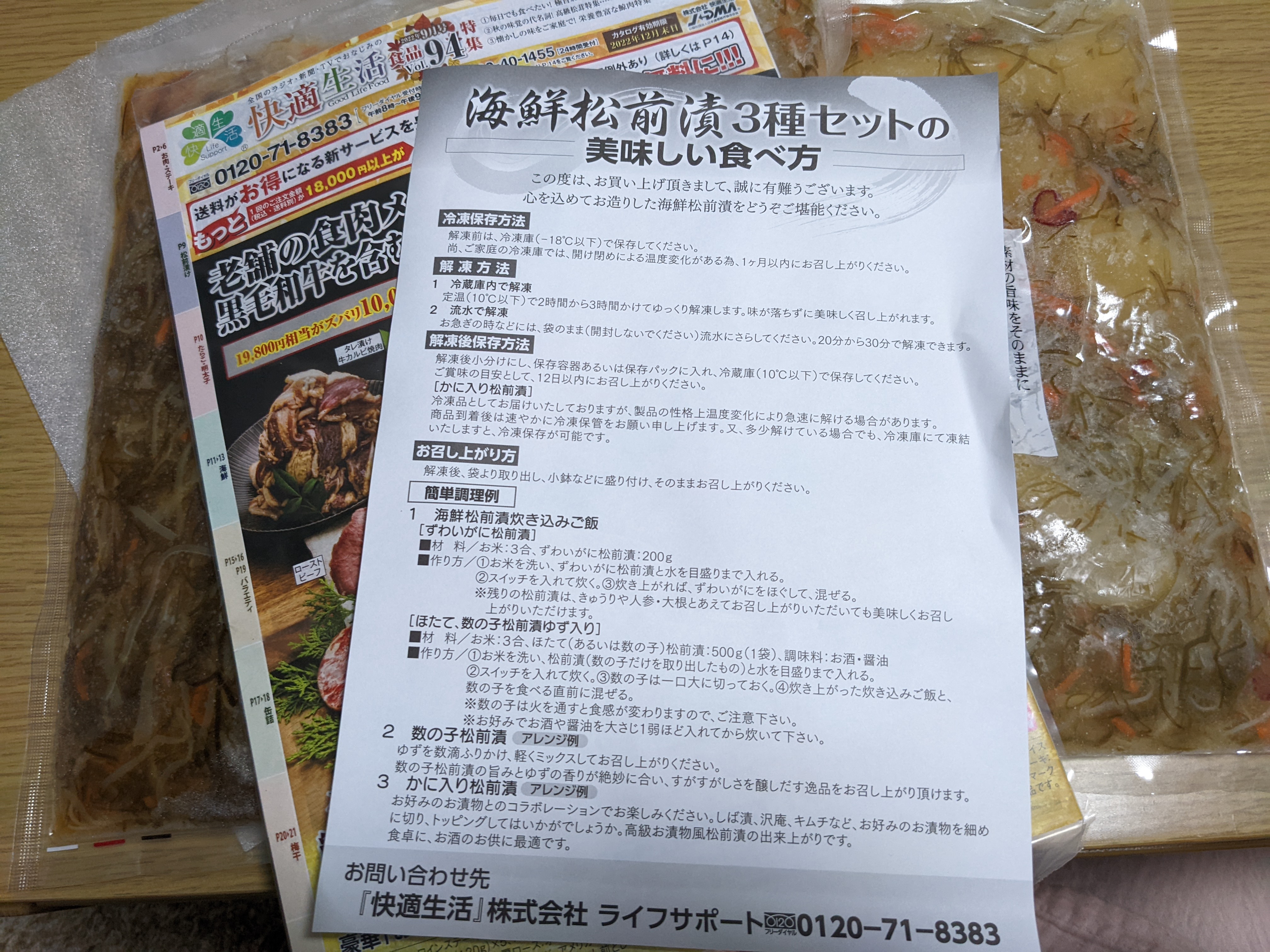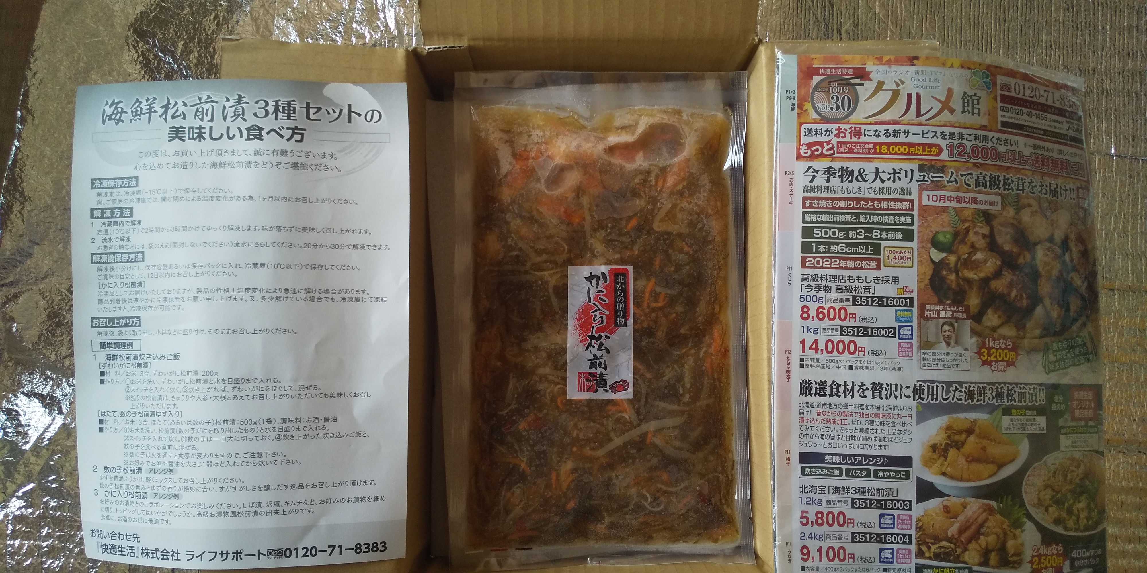 冷凍状態で届きますが、冷凍状態でもわかる具材の大きさ!数の子、ほたて、ズワイガニともにゴロゴロ入っており、とっても美味しそうな見た目で嬉しくなりました。