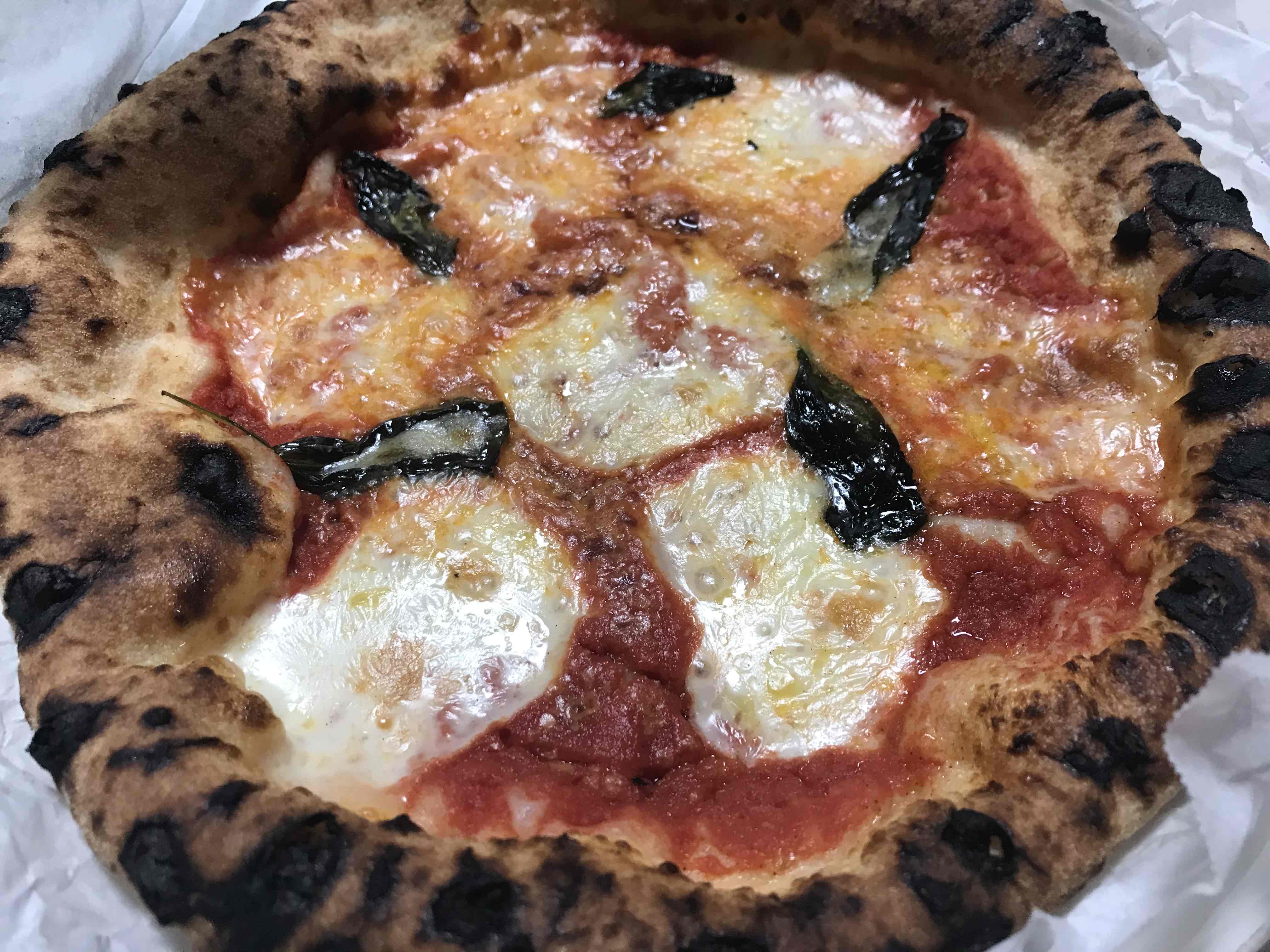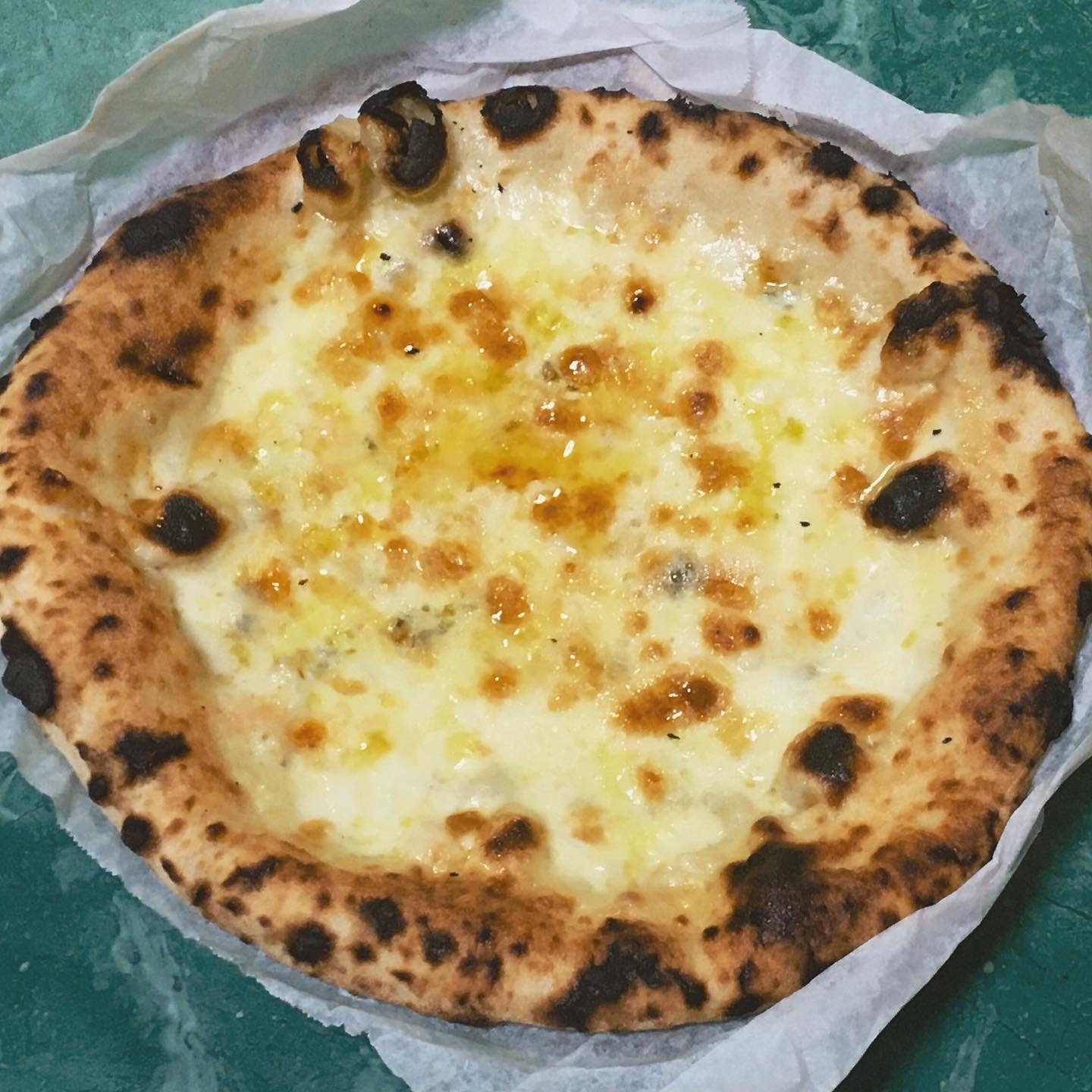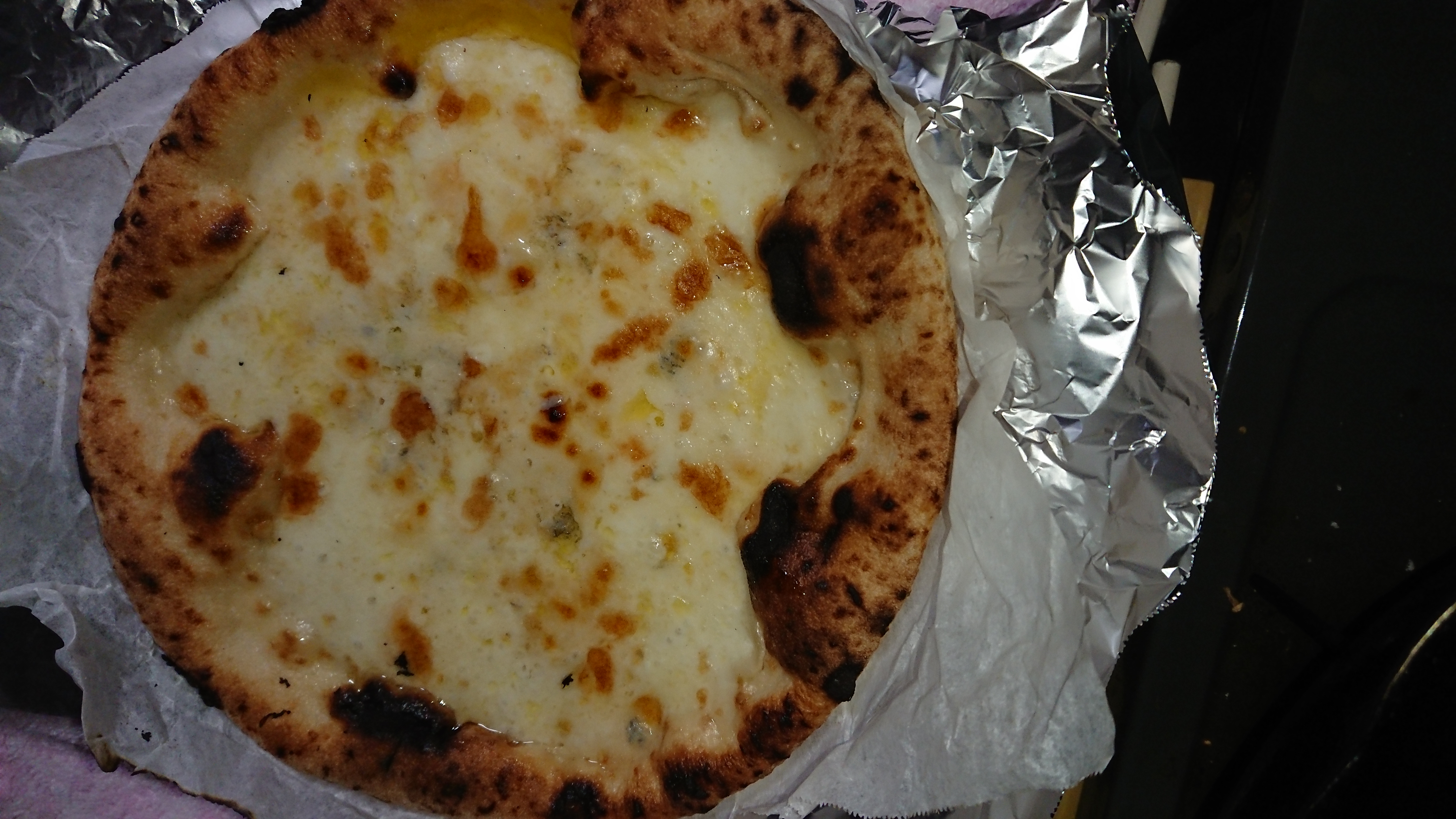 3枚目は、楽しみにしていたクワトロフォルマッジです。贅沢な4種類のチーズのピッツァです。チーズだけなので1~2分ほど早めにグツグツしてきました。熱々グツグツのピッツァにはちみつをまわしかけて、もっちもちの生地にとろーりチーズがたまりません。4種類のチーズで奥深い濃厚な味わいです。チーズの塩気がしっかりしていますので、付属のはちみつをたっぷりかけて頂きました。こちらには赤ワインを合わせました。