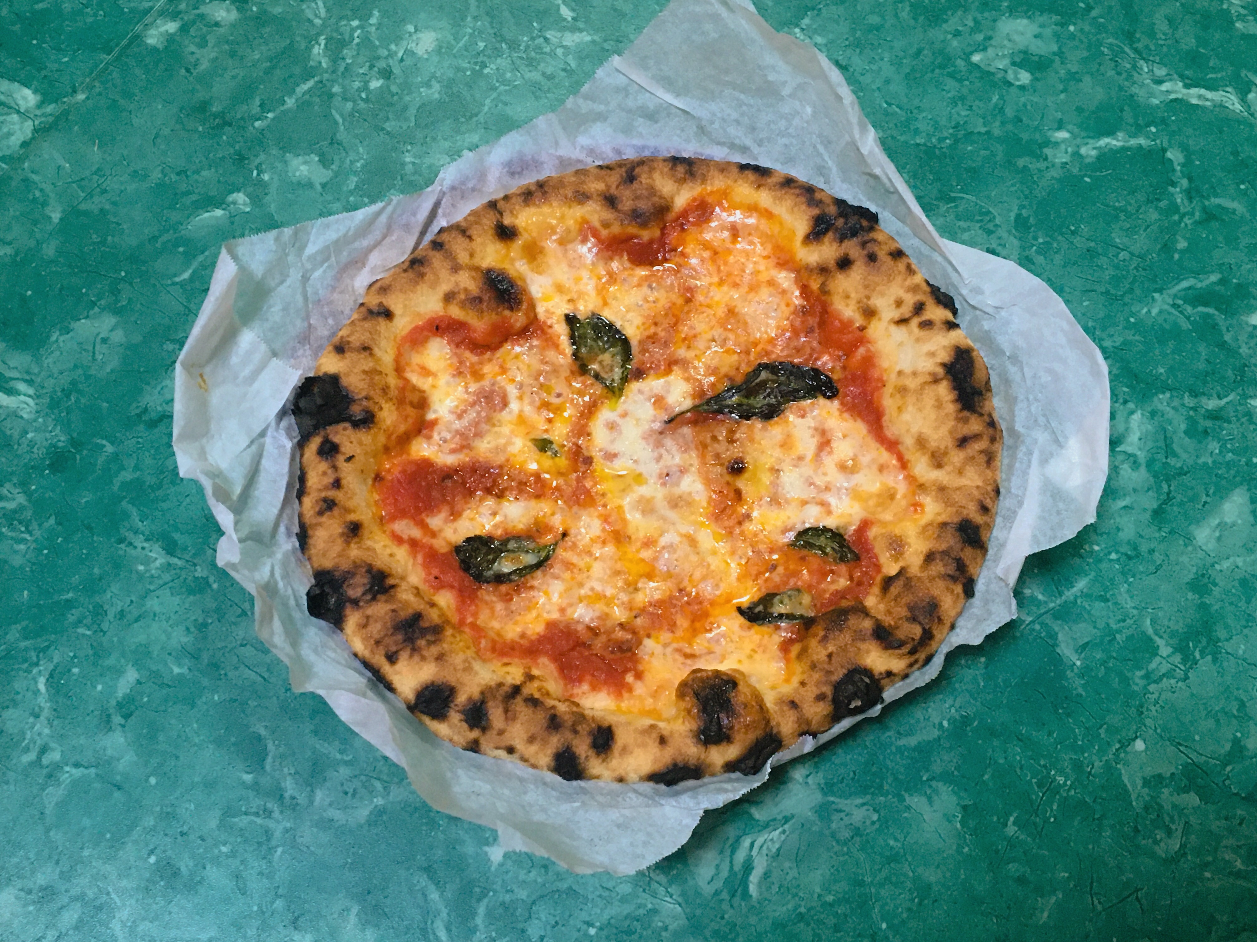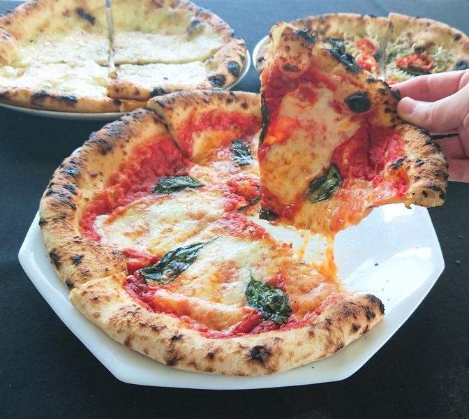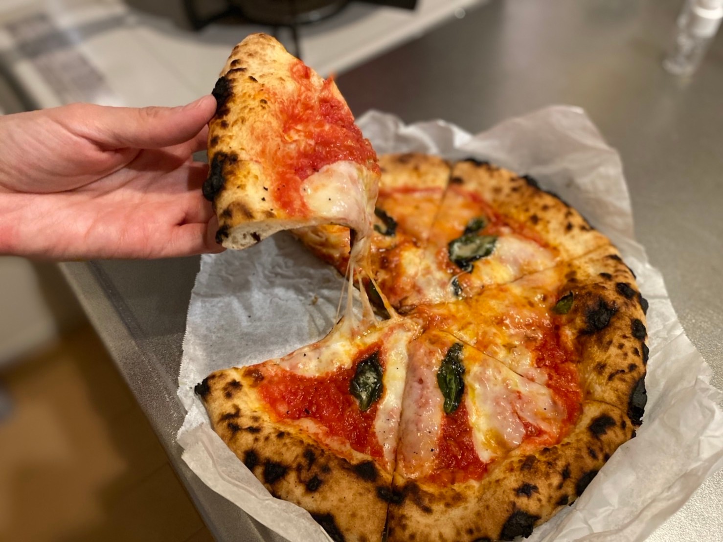 3枚目は、楽しみにしていたクワトロフォルマッジです。贅沢な4種類のチーズのピッツァです。チーズだけなので1~2分ほど早めにグツグツしてきました。熱々グツグツのピッツァにはちみつをまわしかけて、もっちもちの生地にとろーりチーズがたまりません。4種類のチーズで奥深い濃厚な味わいです。チーズの塩気がしっかりしていますので、付属のはちみつをたっぷりかけて頂きました。こちらには赤ワインを合わせました。