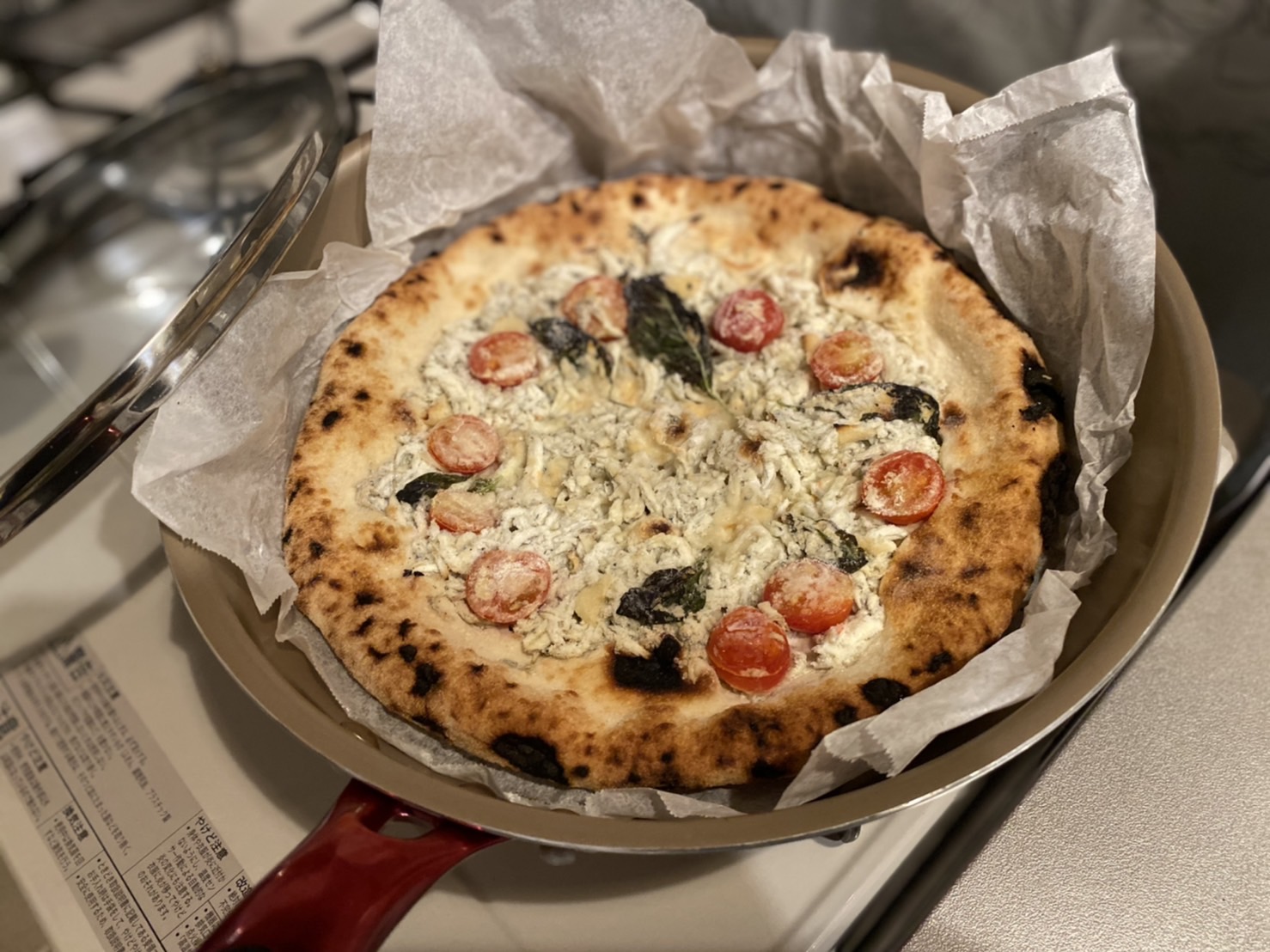 我が家はガス火でテフロンフライパンで15分位でできました。生地が薄くて食べやすく、窯やきの焦げ目が香ばしくて美味しかったです。トマトソースは味がしっかりして、たっぷりのチーズととてもマッチして食べ応えがあります。