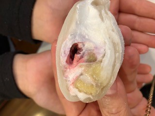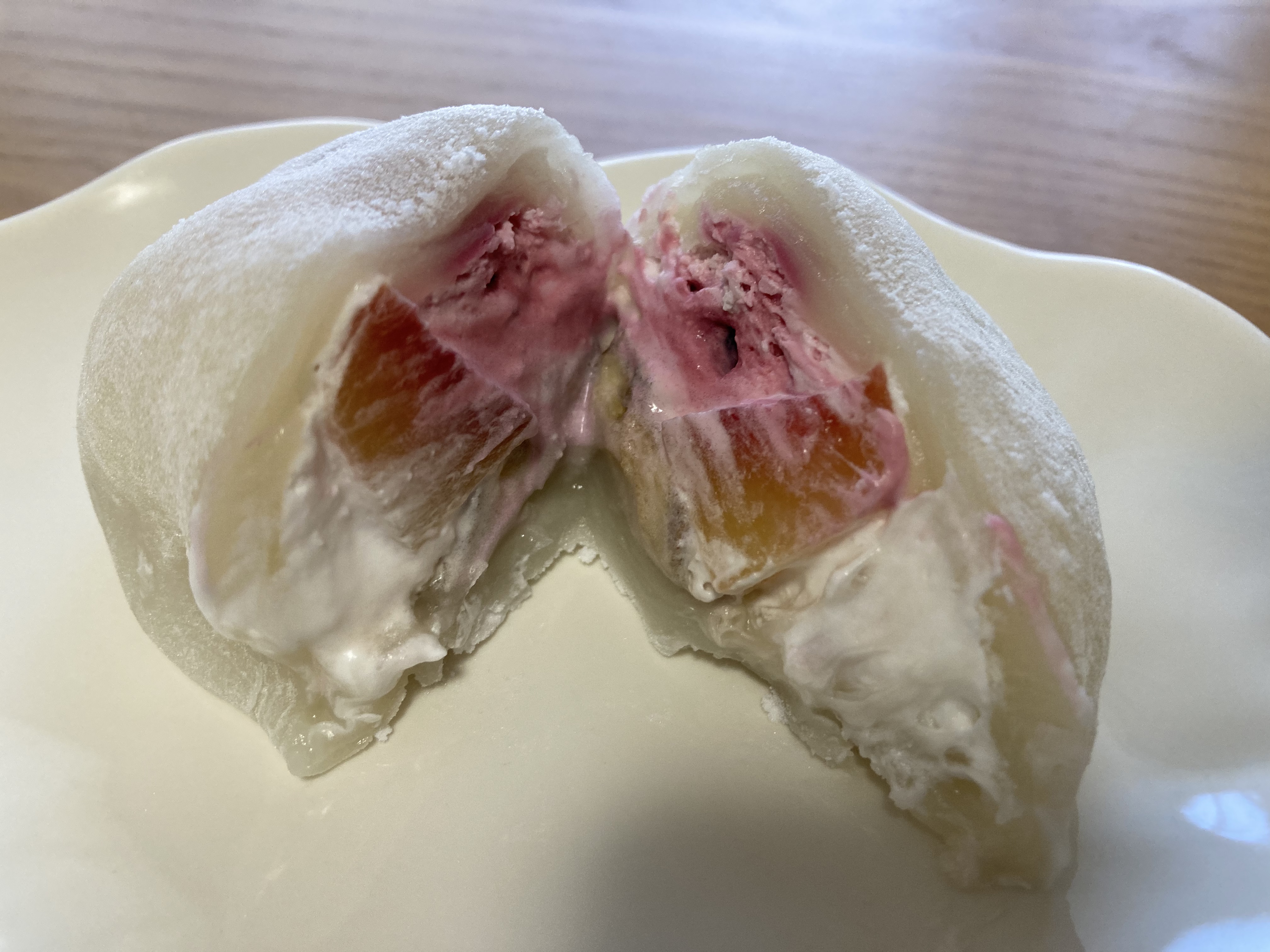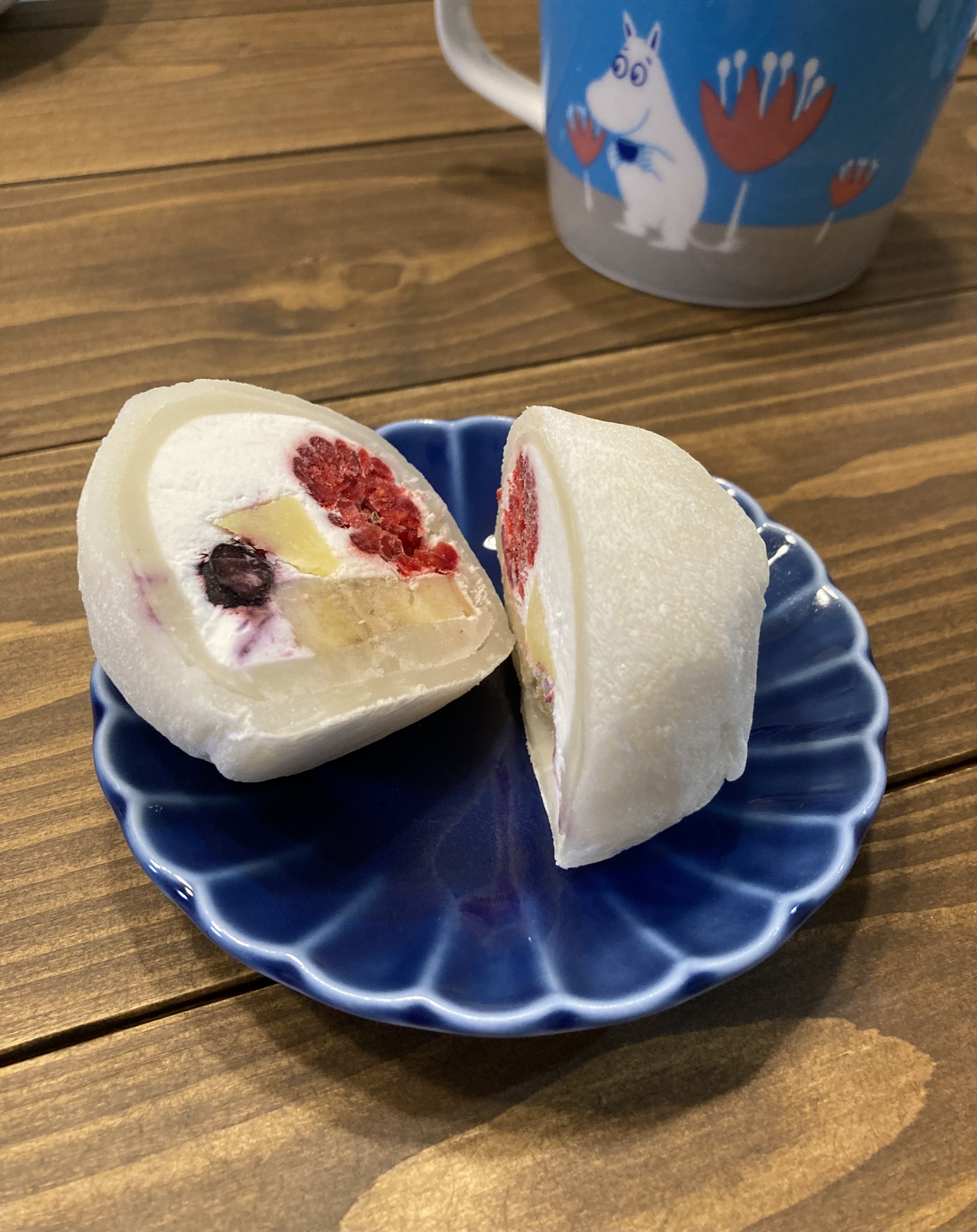 いざ、実食!!1個を4等分し、私と子供たち3人のもとへ、、。「うわー、なにこれー」「おいしー」「ほっぺたおちちゃうよー」と本当に子供たちのそぼくなそのままの感想です。私も、今までにない、今まで味わったことのない食感、なかから、あふれんばかりの生クリーム、そしてフルーツたち、、。そして上品な白あんとのコラボ、、。甘づっぱくて、フルーツのこりがりっとした、食感、、。たまりません!冷蔵で5~6時間まった甲斐がありありで。子供たちはもっとほしいよー、ママ一人で食べないでよ!絶対!と口酸っぱく言われました。それから毎日毎日、本当に幸せな時間をうっとり過ごしました。これは、絶対に誰からも好かれる、誰からも絶賛をもらえる、和?洋?大福だと思いました!!