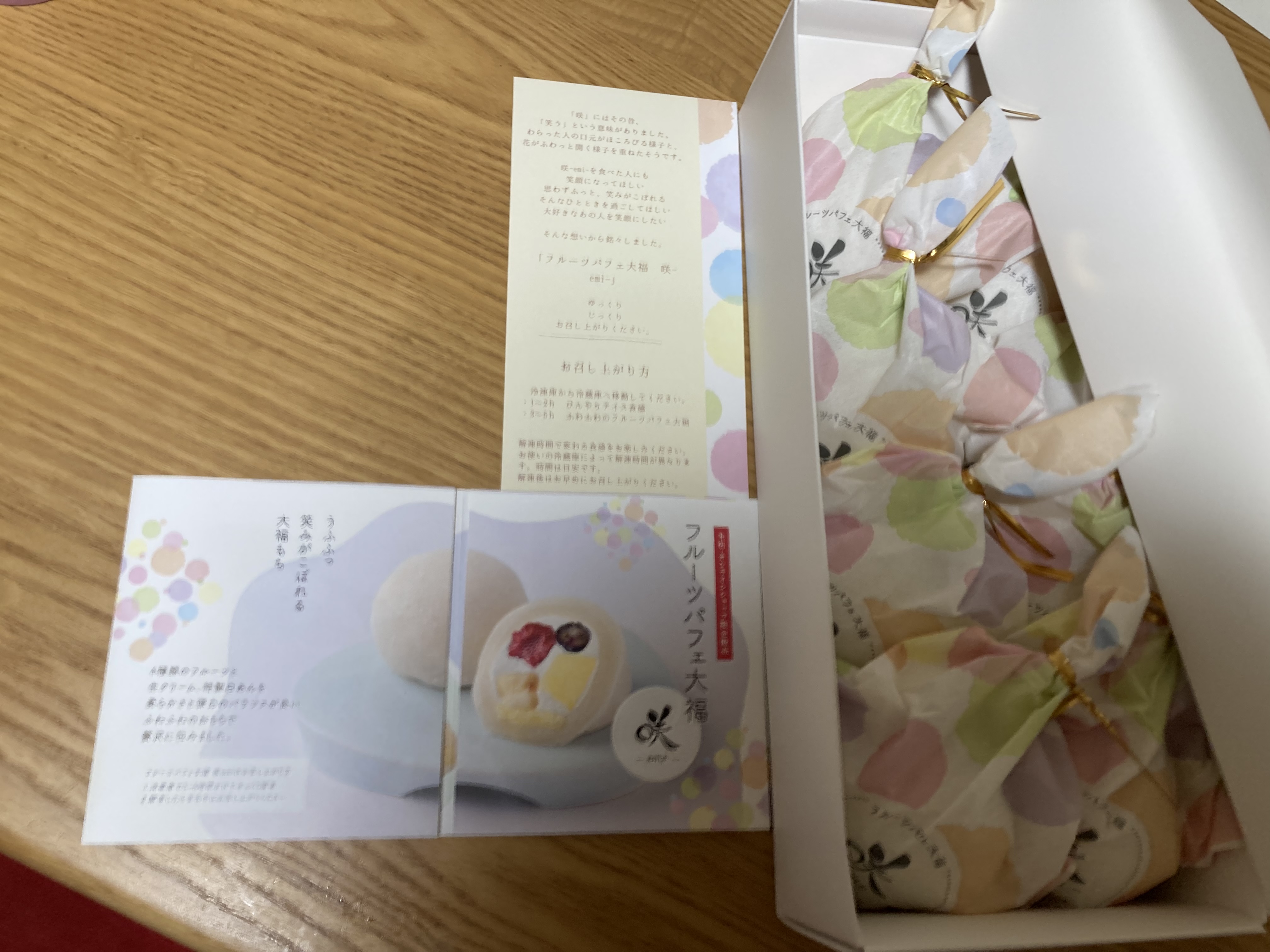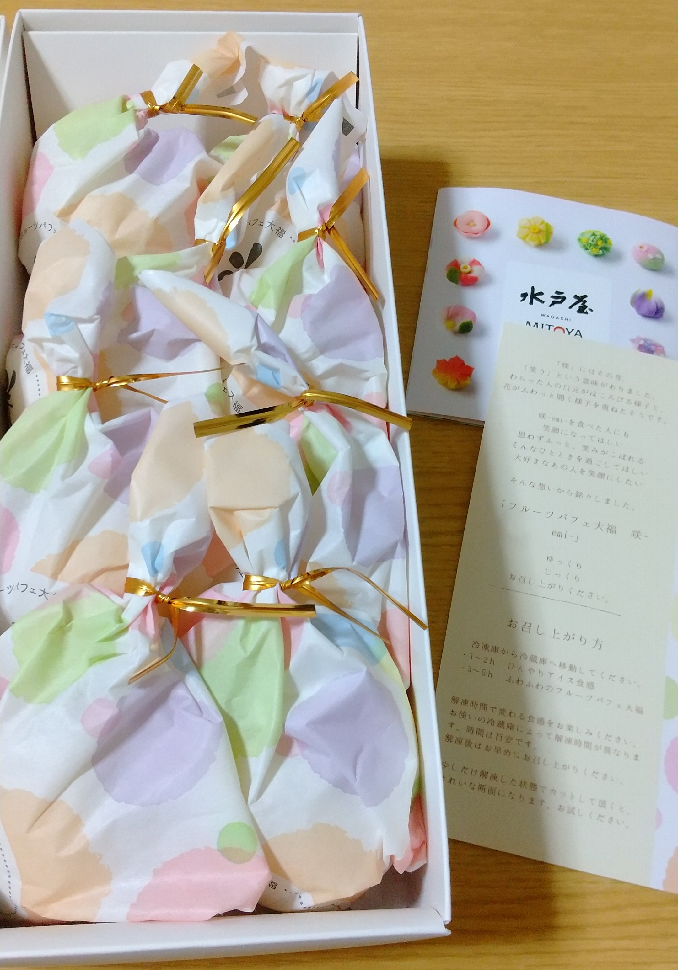 ずっしりとした箱をあけた瞬間、咲(emi)のお花の文字が沢山!!もうテンションマックスで、子供たちと騒いでしまいました。記載通りにまずは、冷凍。週末までのお楽しみね、、といって子供たちをなだめ、いざ、週末。朝一おきて、冷凍庫から冷蔵庫へ。。わくわくがとまらない朝。子供だちも「今日は食べれるんだよね、例のえみ」って起きてきました。