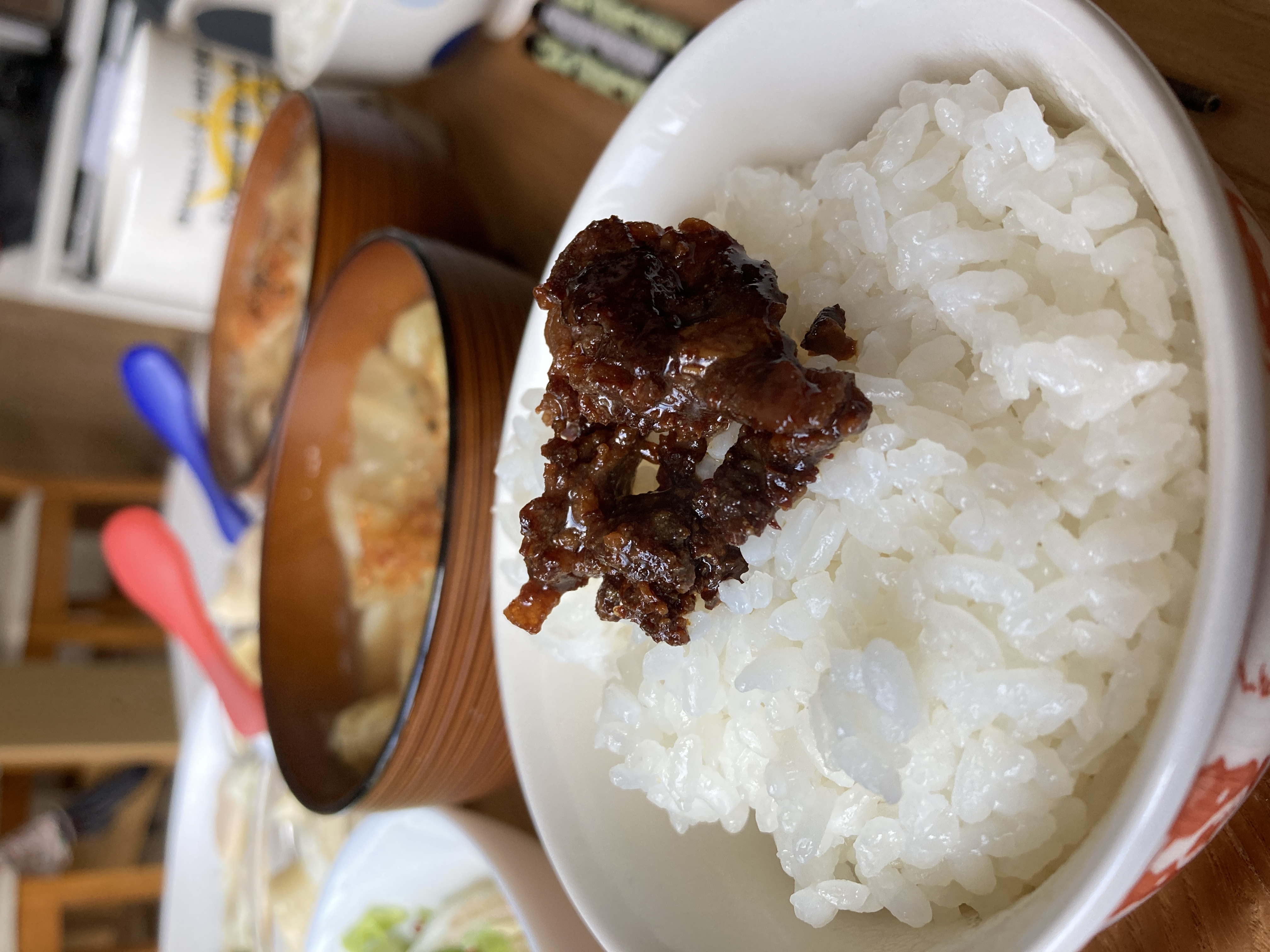 脂身と熱々ご飯が絡んで甘辛いすき焼き味と牛の甘味が交差してすごく美味しい。