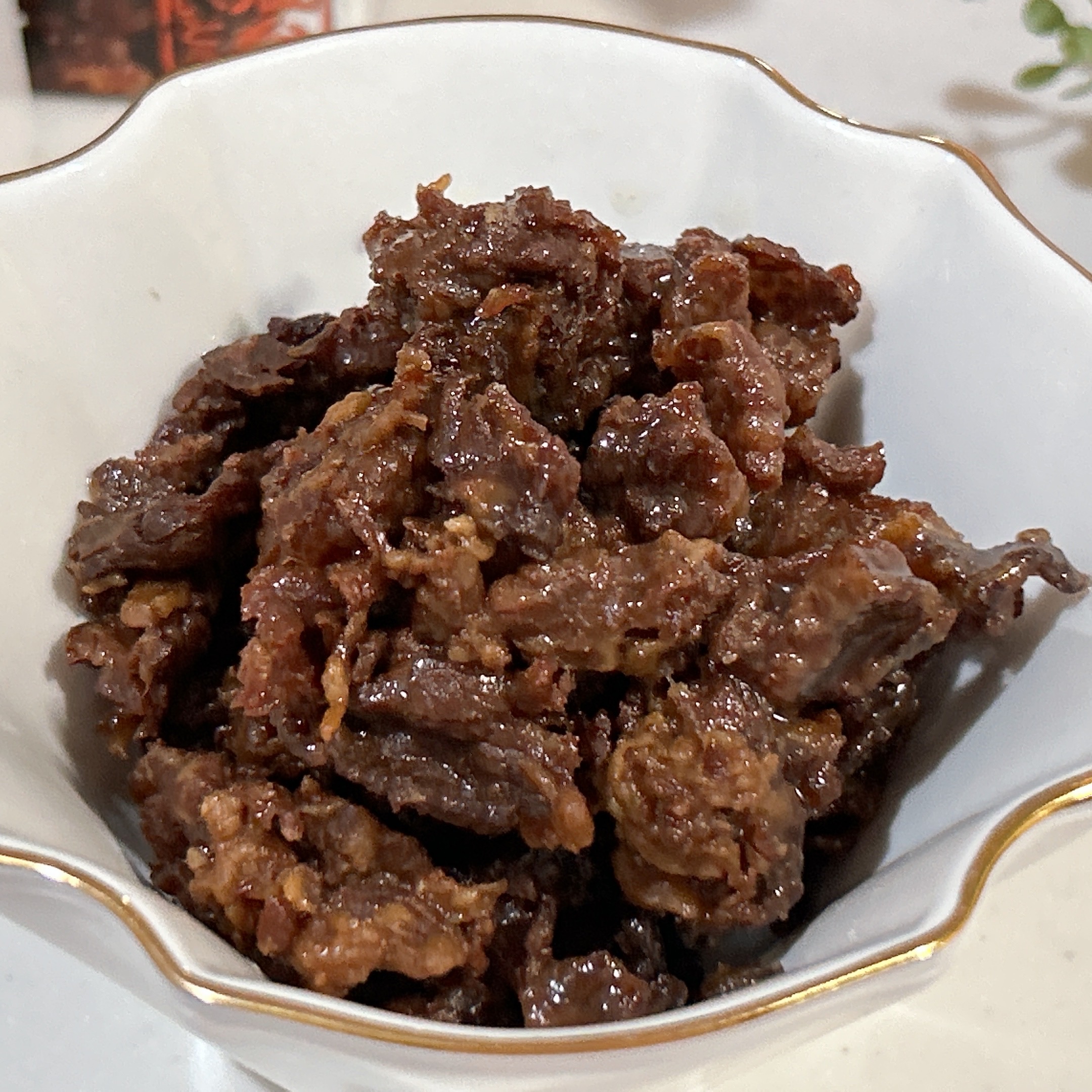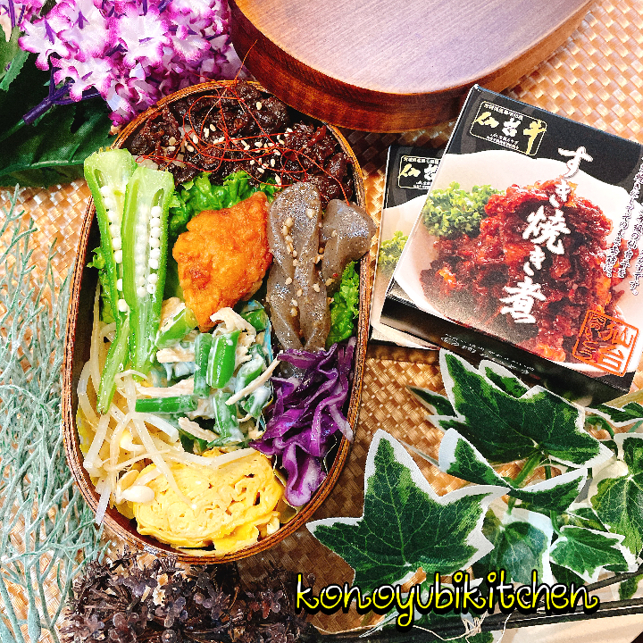 お弁当に入れてみたけど、結構ええ感じやん。糸唐辛子といりごま添えてすき焼き丼もええかもね。