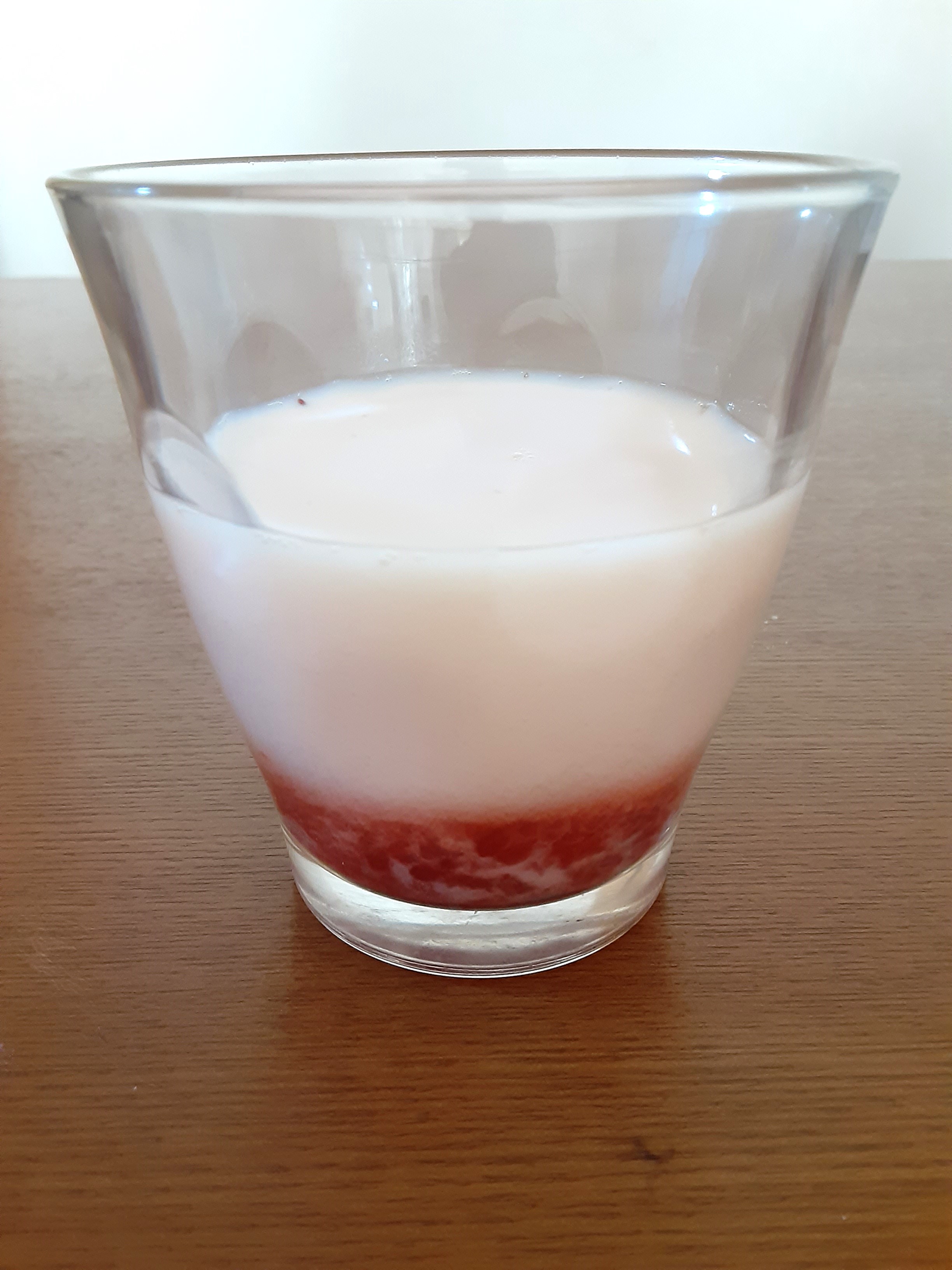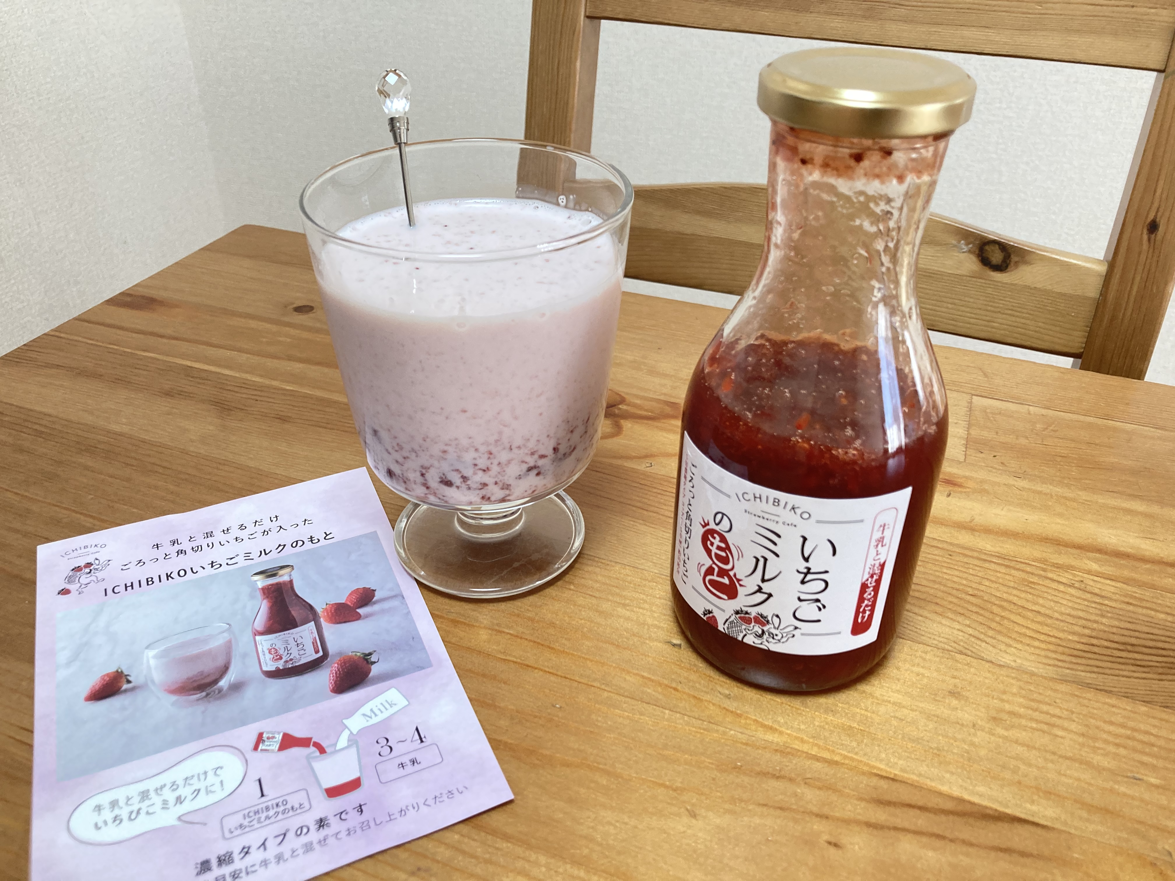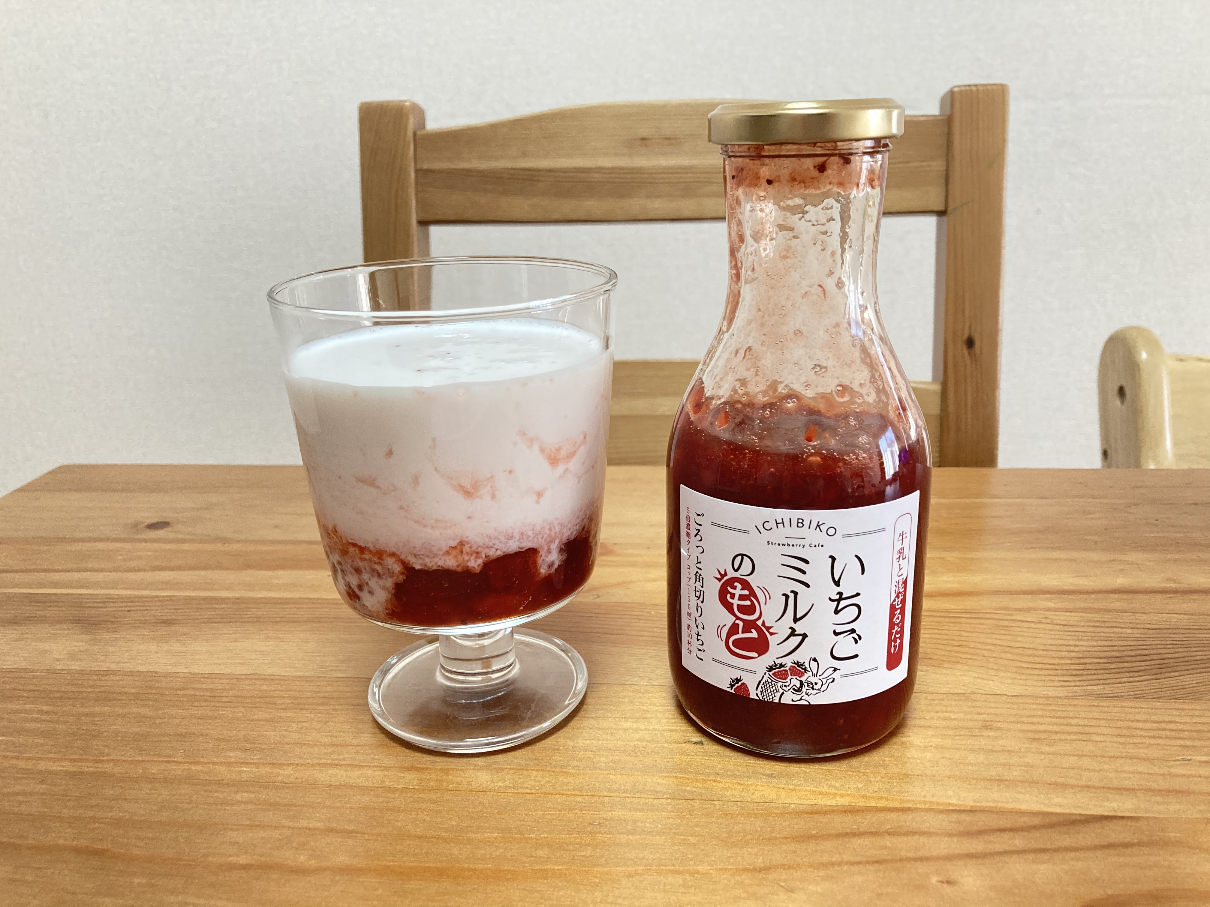 グラスにいちごミルクのもとを入れた瞬間からジャムのような濃厚さと、果肉の多さにびっくり!そして甘酸っぱいいちごの香りがたまらない。牛乳をそーっと注ぐとやんわり混ざりあって可愛らしいピンクになった牛乳と、下にとっぷりと溜まった果肉のコントラストが、どこかのオシャレなカフェのメニューのようでした。