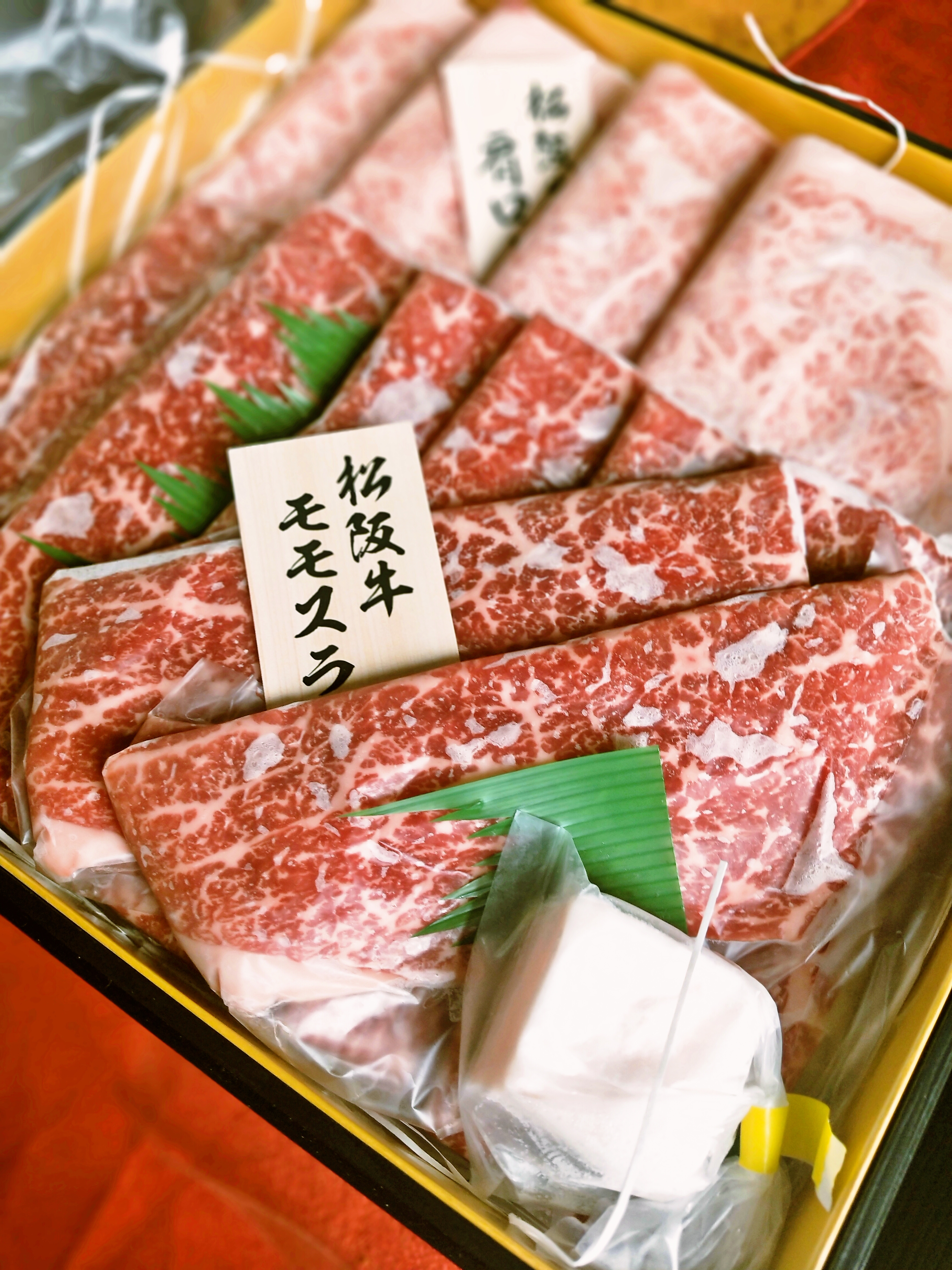 松阪牛の香りと赤身の旨味を自宅で堪能できる豪華セット商品です。オリジナルわりした、たれがつきますので、すき焼き、焼肉などお好きな料理でお楽しみください。