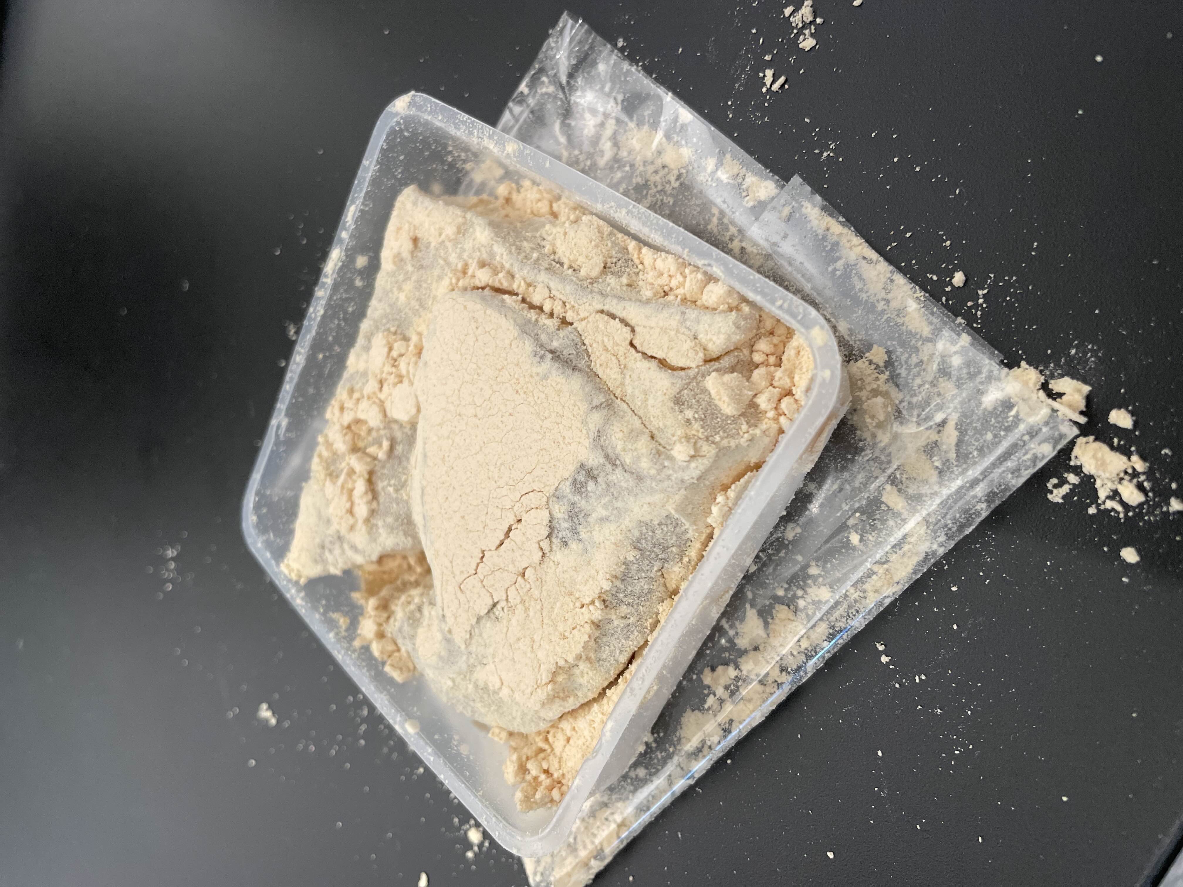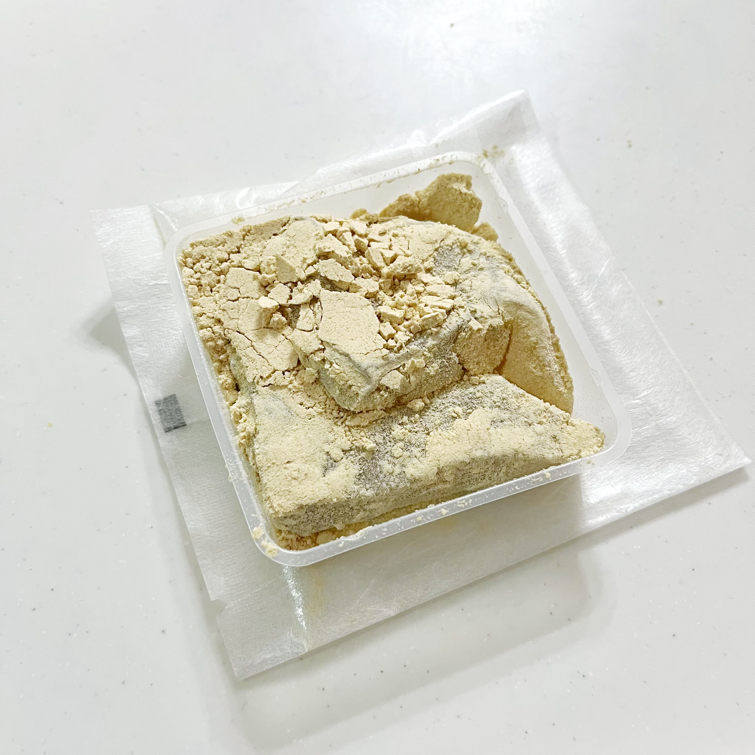袋を開けると透明容器に九十九餅2切れとたっぷりの黄粉が溢れんばかりに入っています。