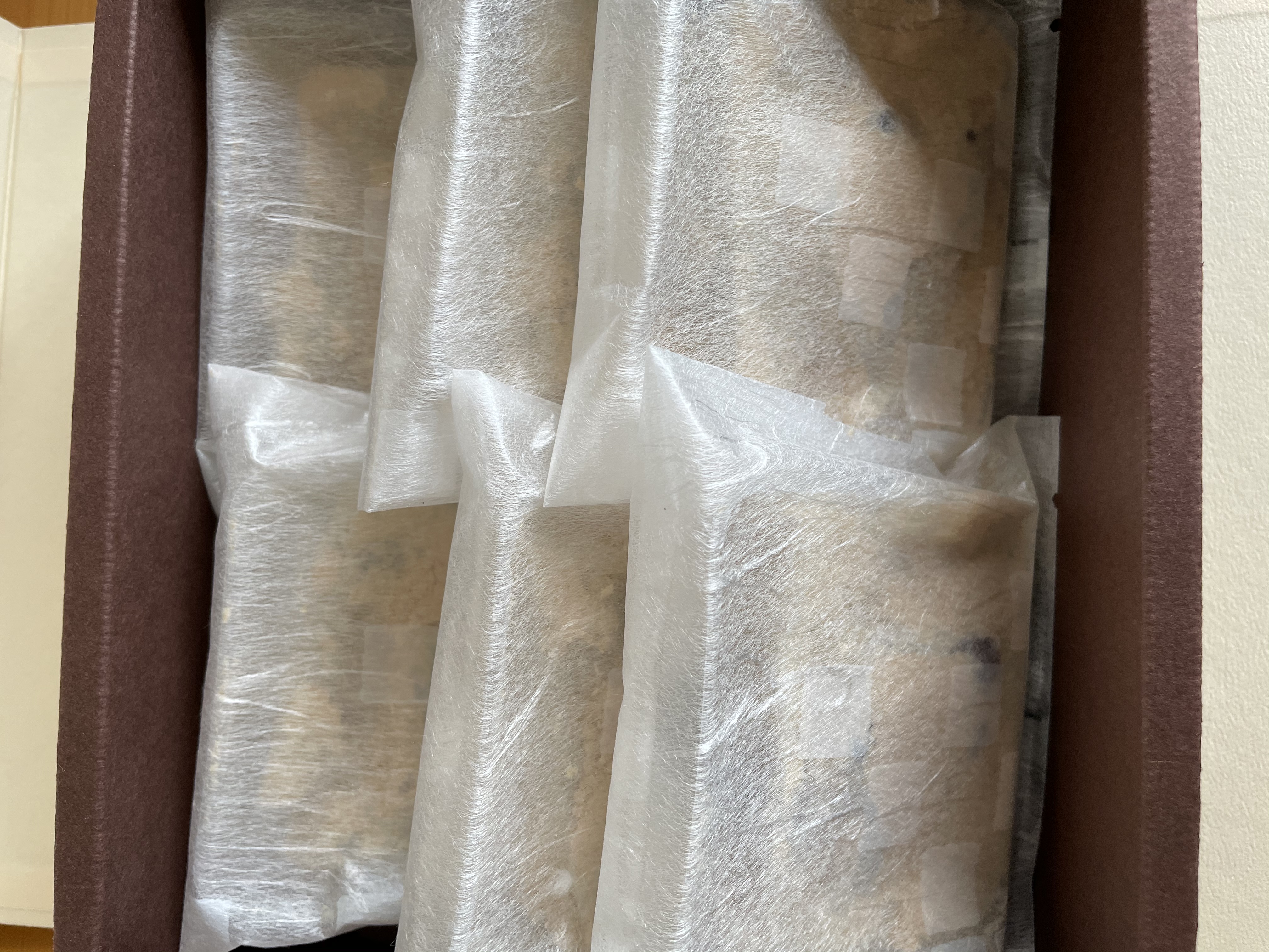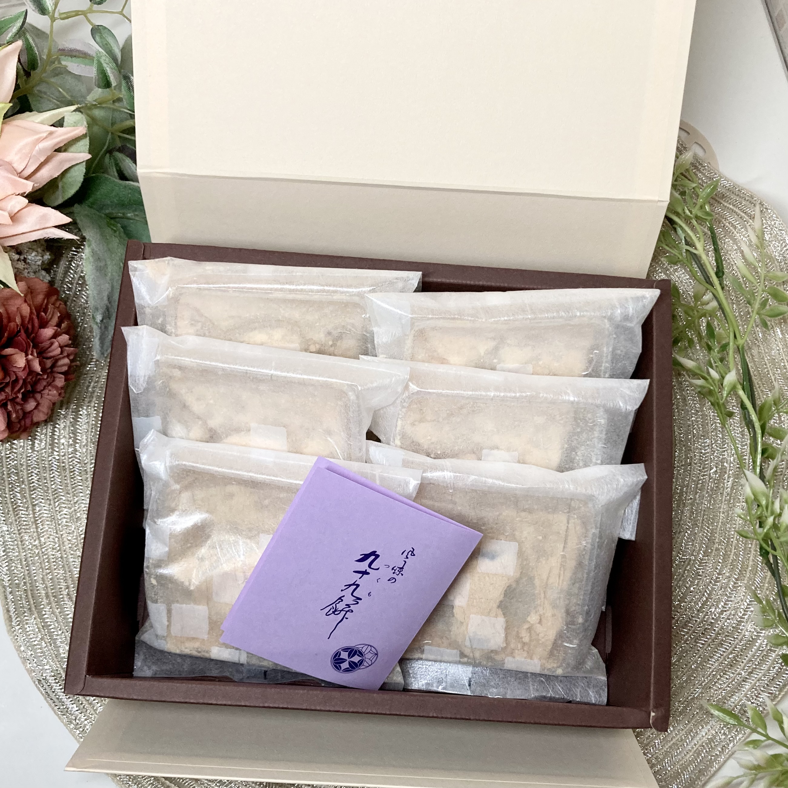 和風感の漂う包装紙を開けると、上品な箱の中に白い袋に入った九十九餅が6袋綺麗に並んで入っています。