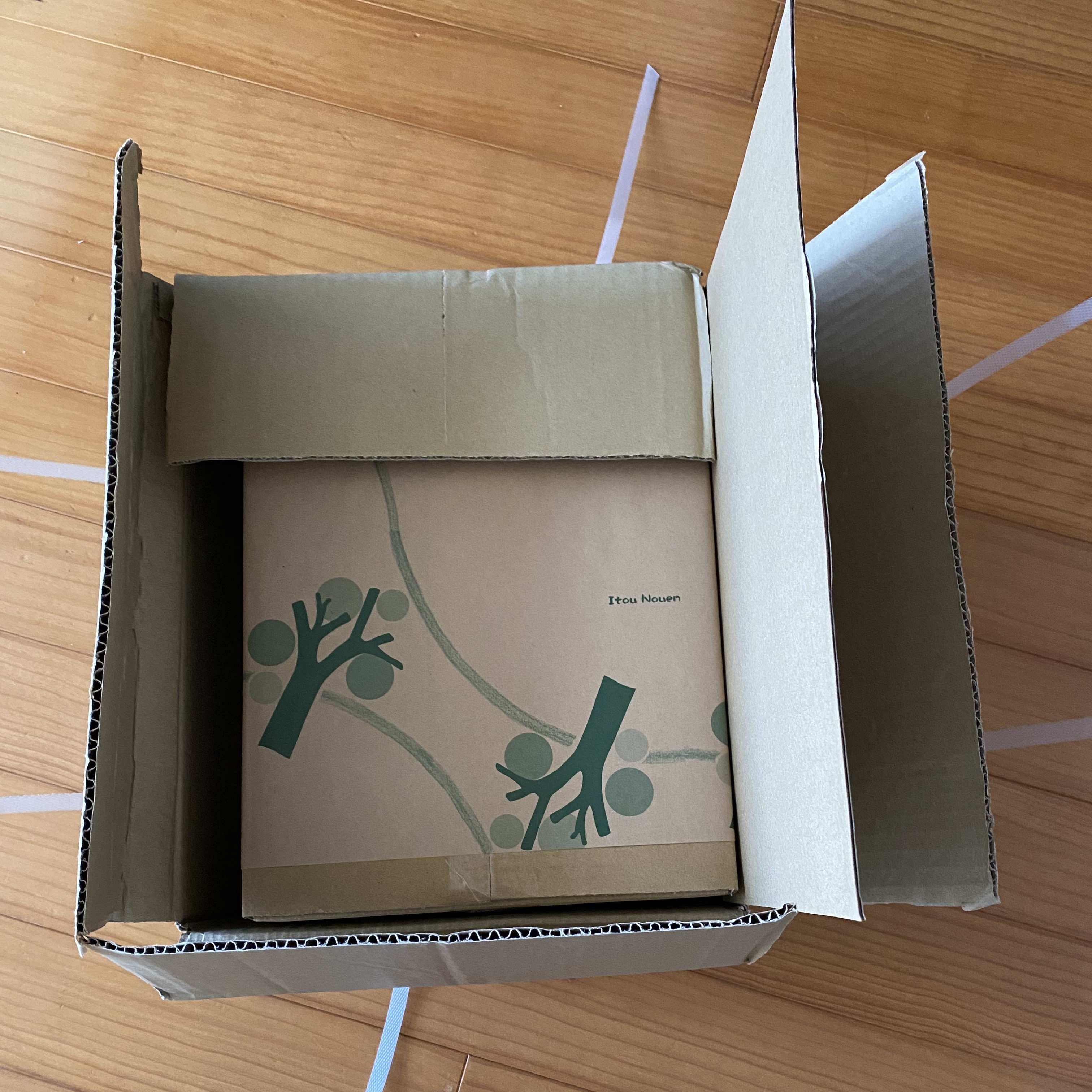 段ボールを開けると、中には包装紙のついた段ボールが入っていて二重の段ボールは初めてでした。開ける期待が高まります。