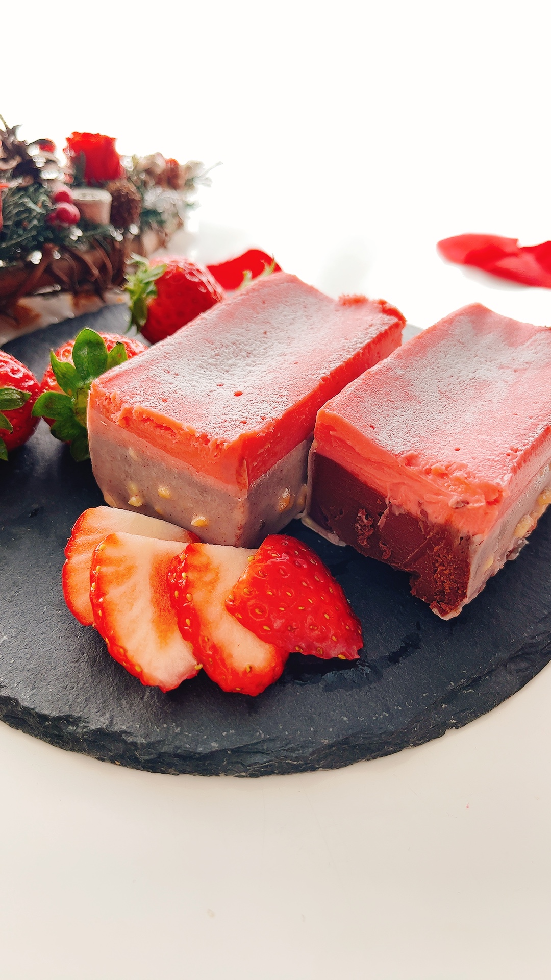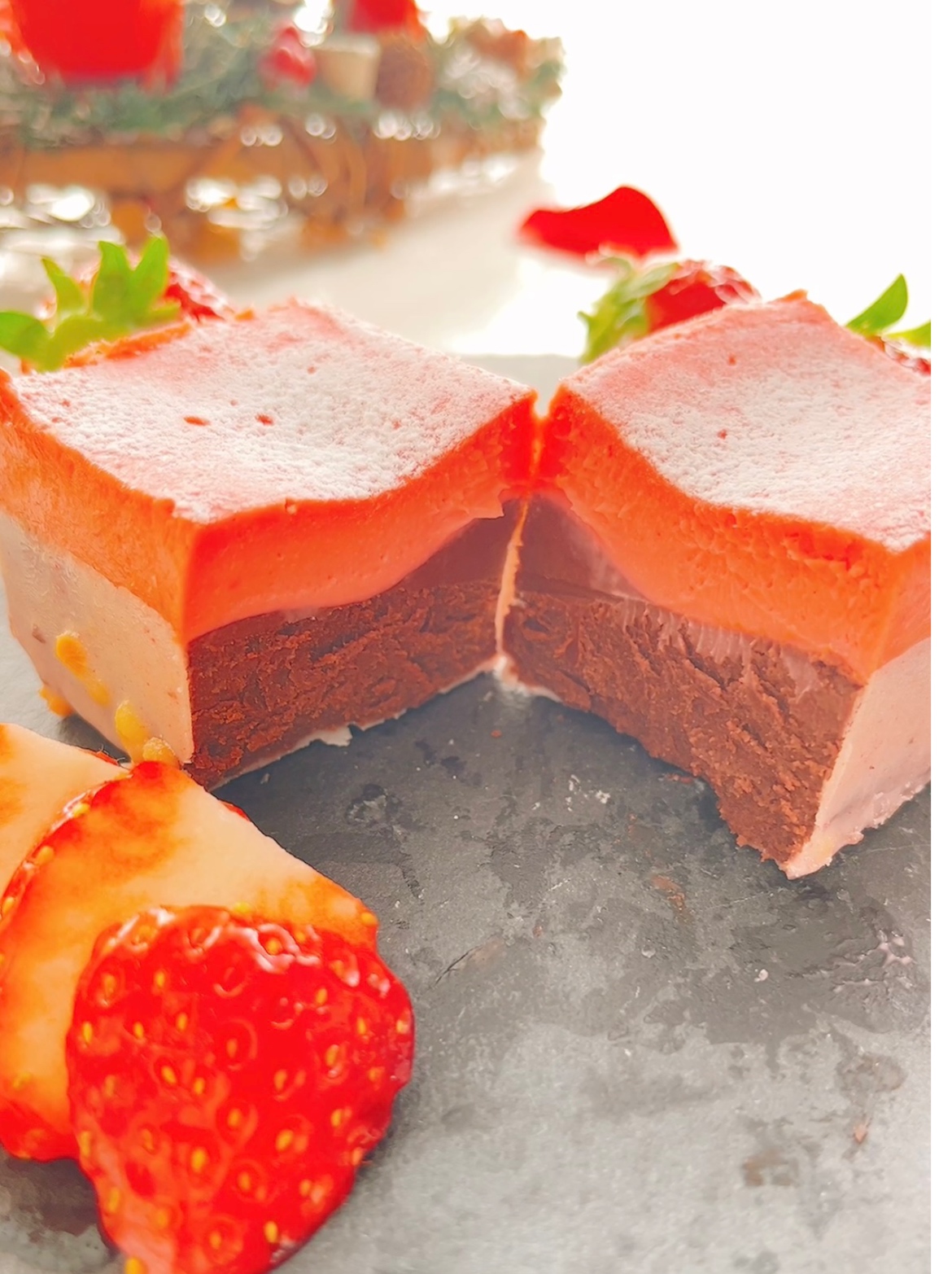 いちごとチョコレートの色が可愛くて見た目が華やかです。切り分けてみると綺麗な二層の断面がでてきます。